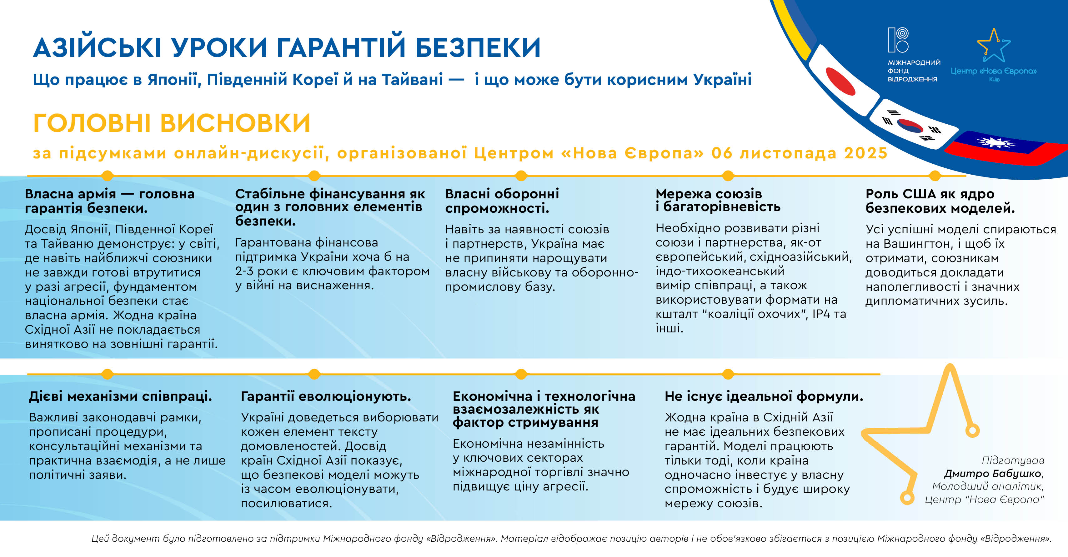 Останні кілька років Центр “Нова Європа” послідовно вивчає досвід країн Східної Азії для того, щоб зрозуміти, які моделі можуть бути корисними для оборони й стримування у складних безпекових умовах, і як Україна може застосувати цей досвід. У 2023 році Центр опублікував дискусійну записку «Формула безпеки “НАТО Плюс”», де серед  досвіду інших країн, проаналізував підходи Південної Кореї та Тайваню до довгострокового стримування загроз. У квітні 2025 року команда Центру підготувала серію інфографік про міжнародні військові місії, включно з історичними прикладами Японії та Південної Кореї, щоб виявити ключові передумови успішної військової місії для України. Цього ж року “Нова Європа” організувала цикл дискусій із провідними експертами з Японії, Південної Кореї та Тайваню, присвячених тому, як азійські країни формують і підтримують оборонну стійкість у складних безпекових умовах. Ці дискусії дозволили порівняти різні підходи, від союзницьких гарантій безпеки до моделей, що спираються на власні оборонні спроможності.