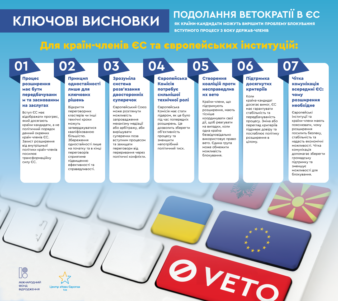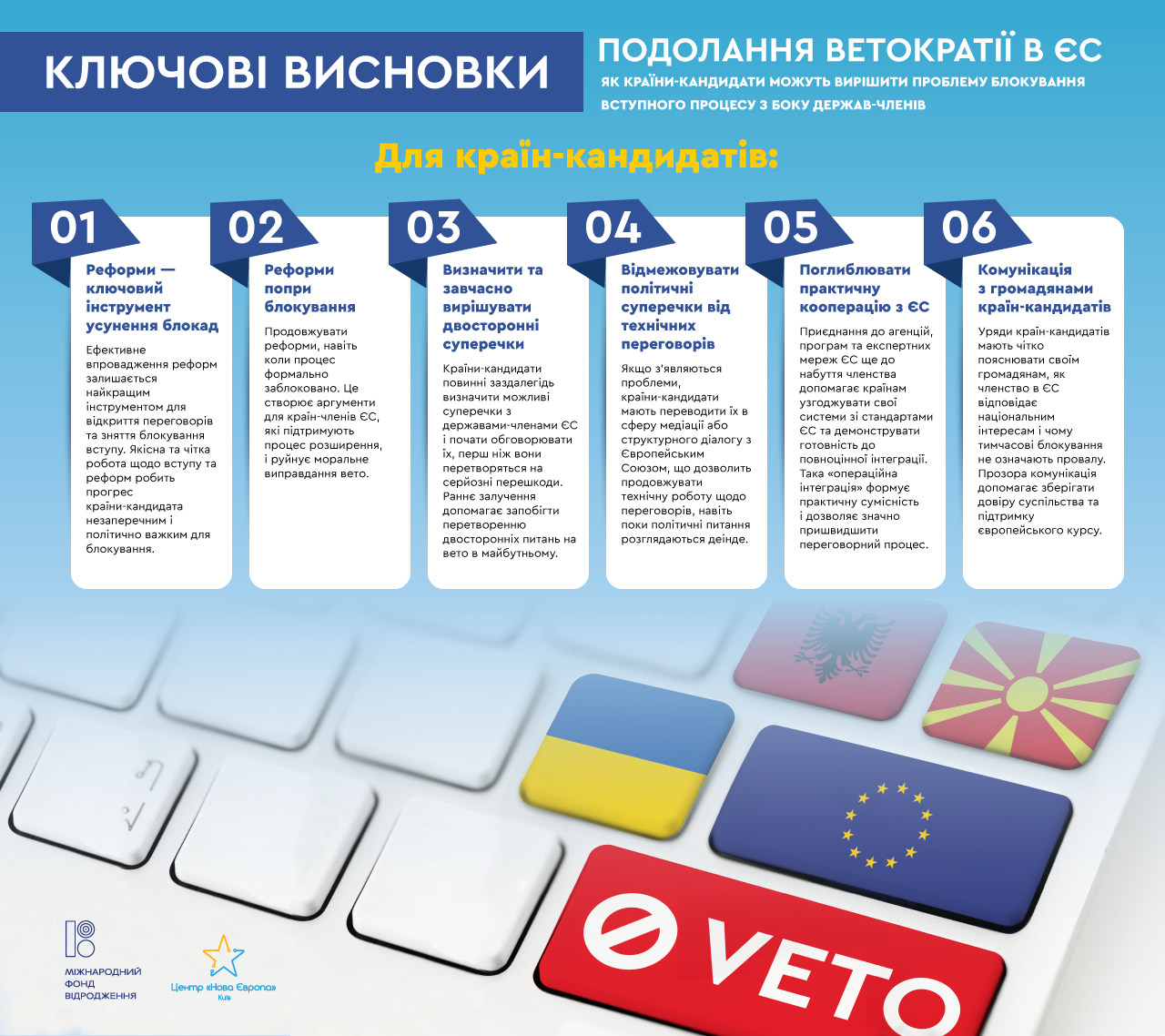 Країни-кандидати не можуть безпосередньо обійти вето держав-членів, однак вони можуть не допустити повної зупинки процесу, зосередившись на реформах, необхідних для прискореної інтеграції до ЄС. Упроваджуючи ці реформи – від зміцнення верховенства права та антикорупційних заходів до наближення до acquis ЄС та розбудови інституційної спроможності — країни-кандидати можуть зробити свою готовність незаперечною. Це створює сильнішу основу для ЄС у формуванні консенсусу між державами-членами та, зрештою, в отриманні одностайної згоди, необхідної для наступних етапів.