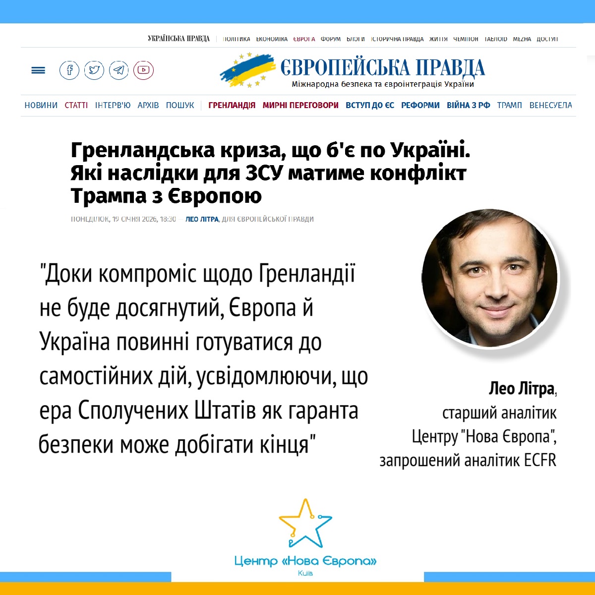 Лео Літра, старший аналітик «Нової Європи», запрошений аналітик ECFR, на сторінках «Європейської правди» пояснює, як події навколо Гренландії створюють безпосередню загрозу обороні України у війні проти Росії, а також змушують кардинально переоцінити всю архітектуру безпеки Європи і її відносини зі своїм головним союзником, яким тривалий час були США.