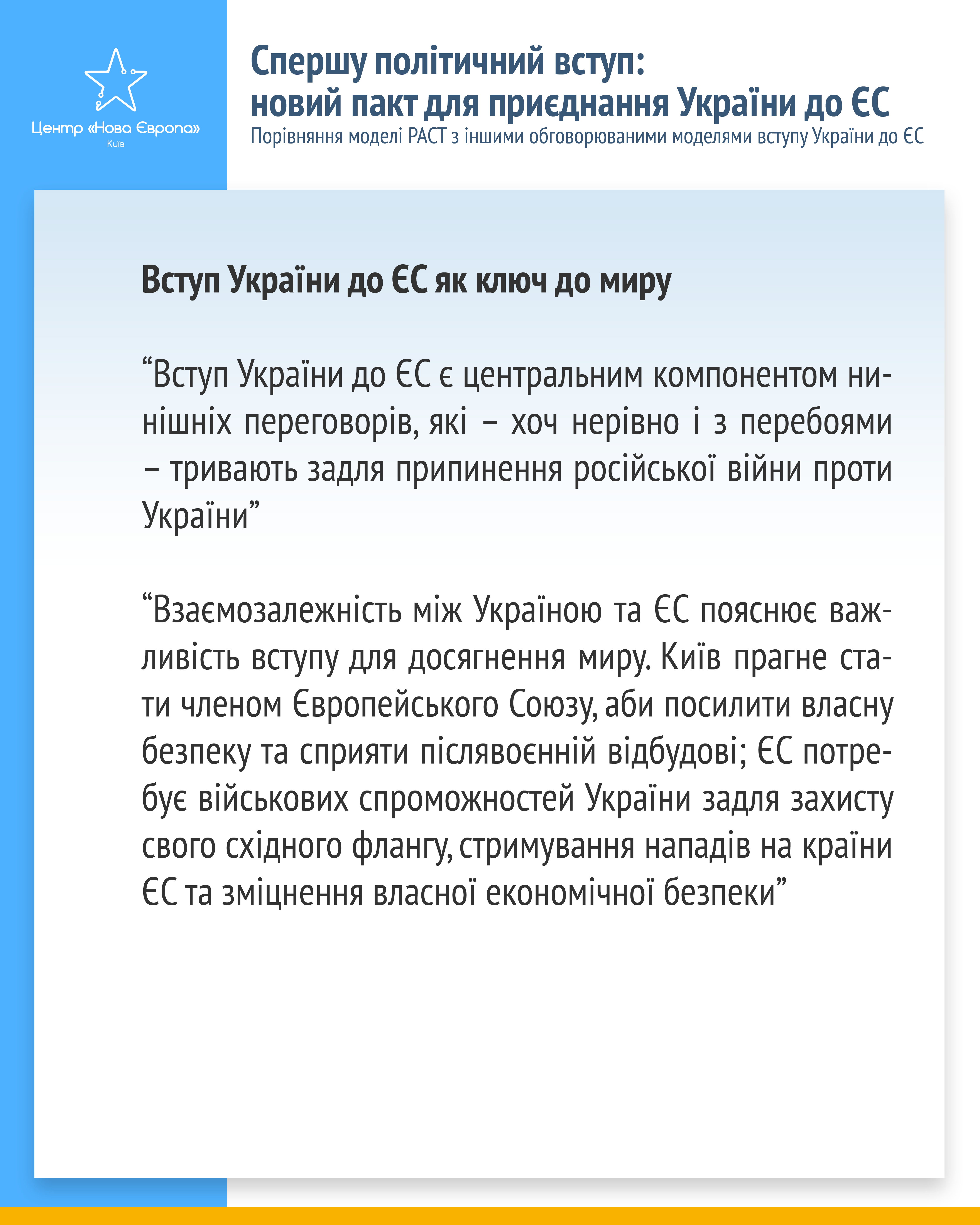 Відповіддю може стати модель вступу, яка відразу надає політичний статус членства для забезпечення миру. Це дозволить Україні інтегруватися в політичну та безпекову сферу ЄС, включно з негайним застосуванням статті 42(7) – положення ЄС про спільну оборону. Ця модель також передбачала б надання Україні права голосу в Раді з питань, що стосуються кластеру «основ». (Це базувалося б на підході «зворотного членства», але зі значними змінами). Така перспектива стала б потужним стимулом для політичного керівництва України укласти мирну угоду.
