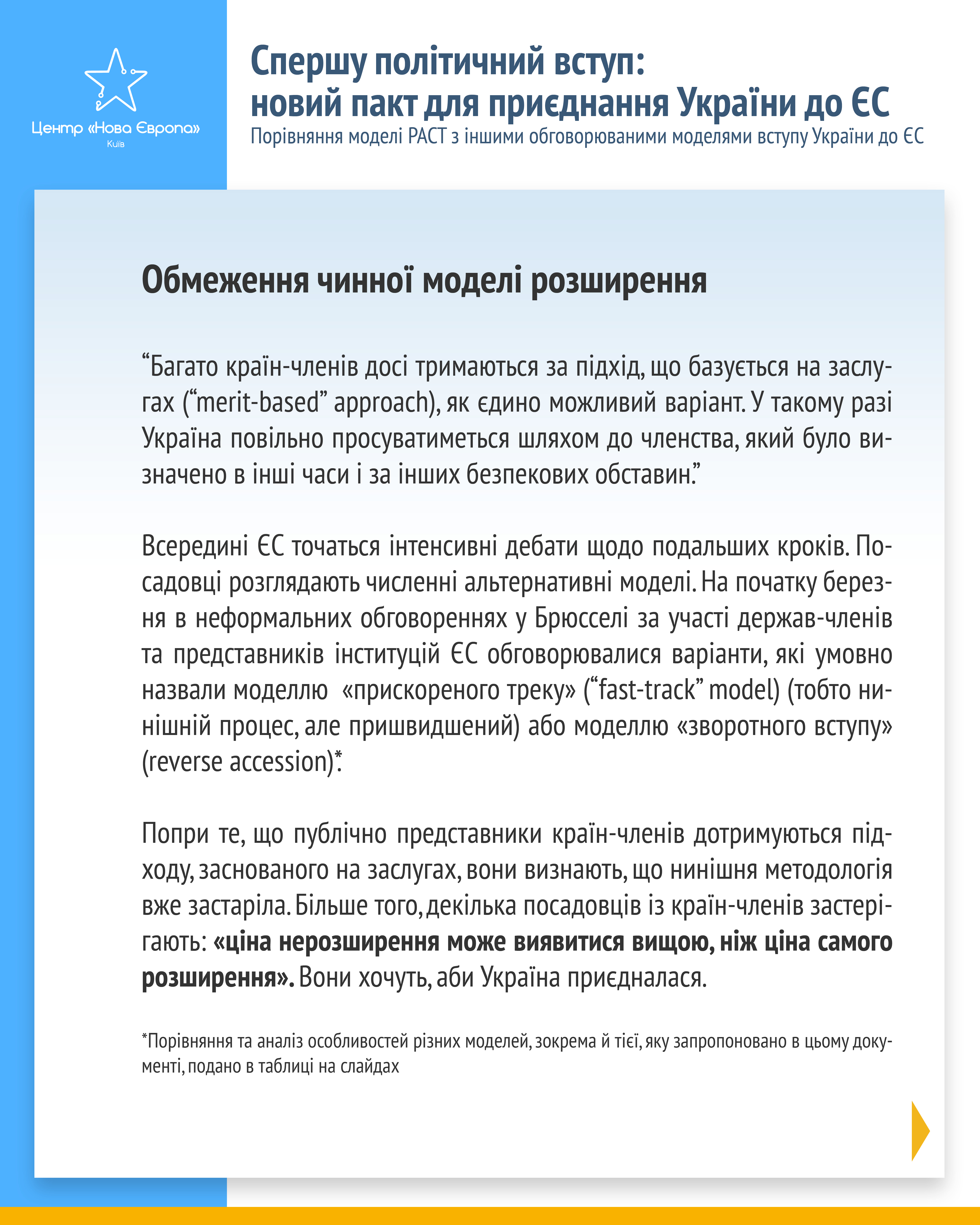 Головна проблема Багато урядів країн-членів ЄС вважають, що прискорений шлях політично складний та юридично заплутаний. Критики зазначають, що такий підхід створює стан “полегшене членство”, послаблює цілісність ЄС та може суперечити логіці Статті 49. Країни-кандидати побоюються, що  цей підхід може призвести до постійного статусу “другорядного” або “часткового” членства, без можливості досягти повноправного статусу. Вимагає складного юридичного обґрунтування винятків. Крім того, переконати держави-члени відмовитися від одностайності (права вето) на проміжних етапах відкриття нових прав буде вкрай складним політичним завданням.