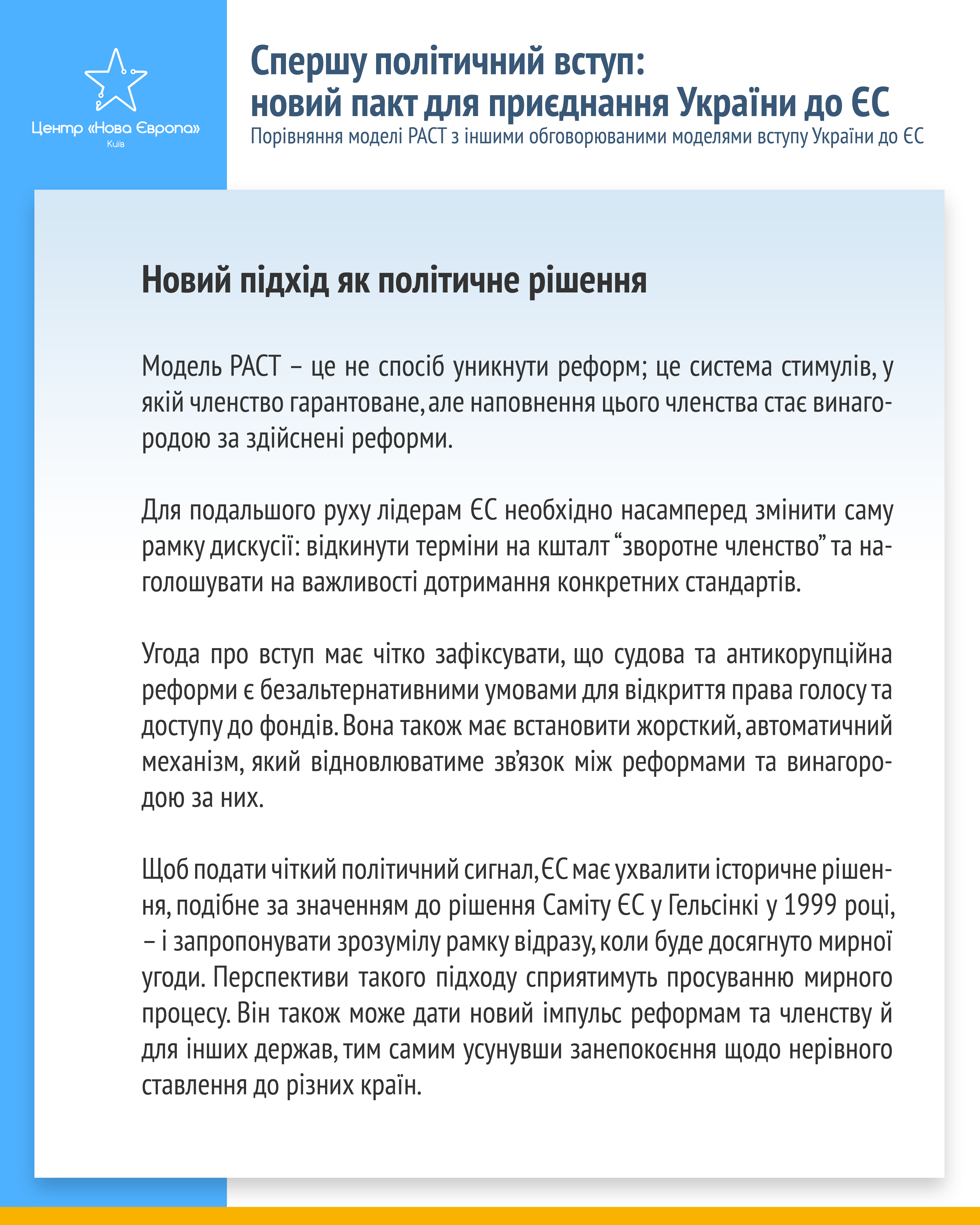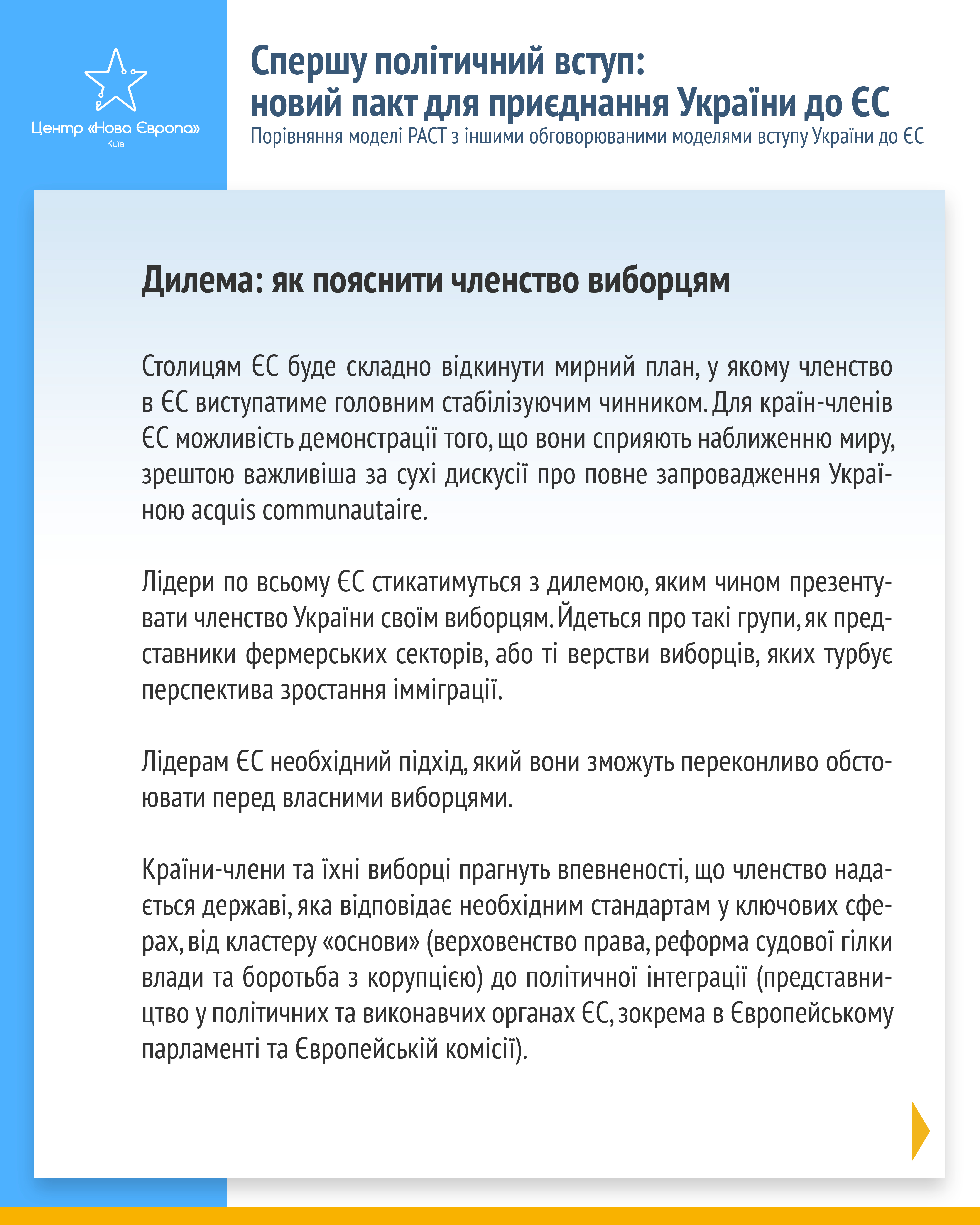 Лідерам ЄС необхідний підхід, який вони зможуть переконливо обстоювати перед власними виборцями. Вони хочуть – і потребують, – щоб Україна приєдналася до ЄС; але вони також мають бути впевненими, що країна впроваджує суворі реформи. Країни-члени та їхні виборці прагнуть впевненості, що членство надається державі, яка відповідає необхідним стандартам у ключових сферах, від кластеру «основи» (верховенство права, реформа судової гілки влади та боротьба з корупцією) до політичної інтеграції (представництво у політичних та виконавчих органах ЄС, зокрема в Європейському парламенті та Європейській комісії). Водночас обраний шлях до членства має бути переконливим і для сторін будь-якого майбутнього мирного договору, насамперед для України та її громадян.