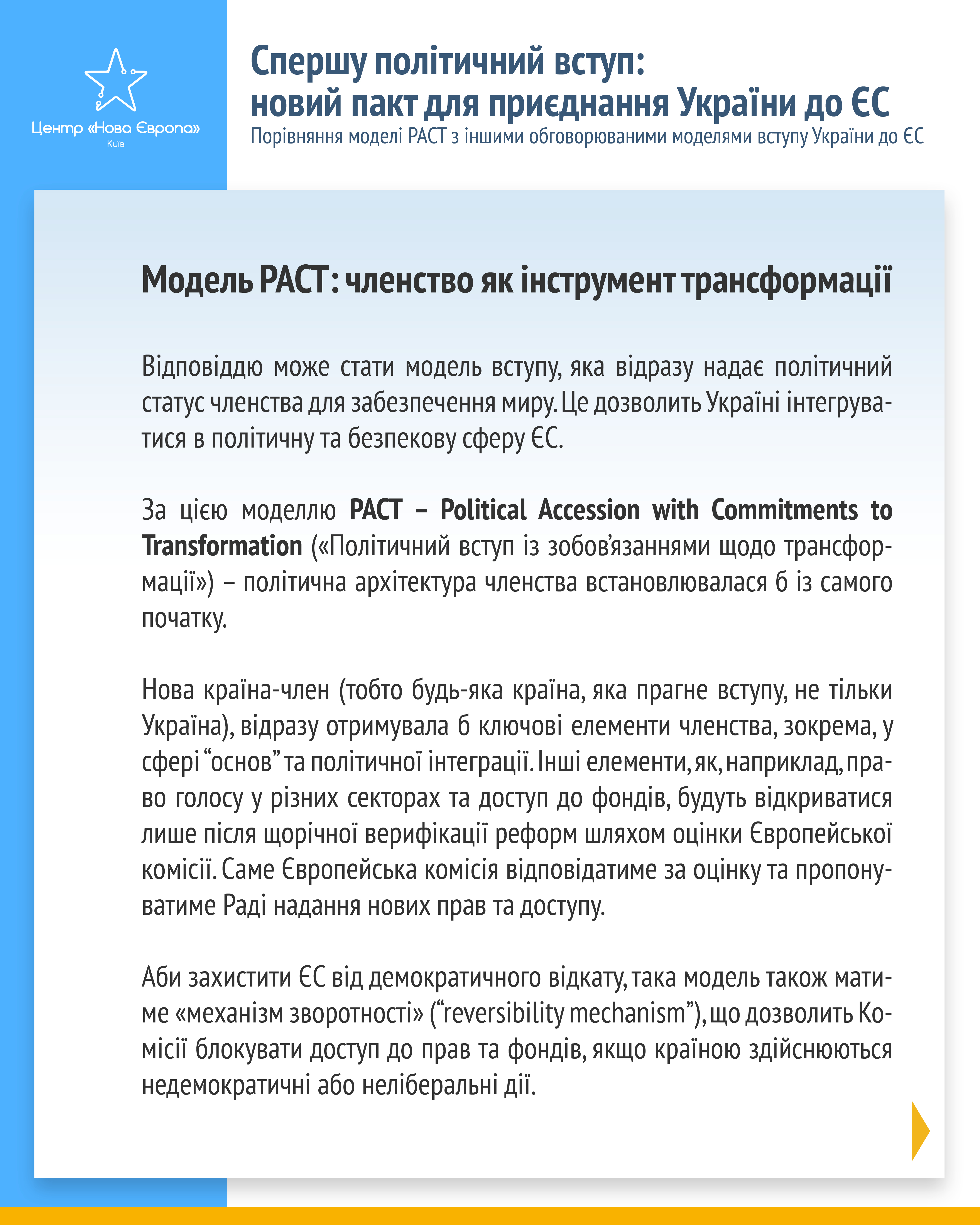 За цією моделлю PACT – Political Accession with Commitments to Transformation («Політичний вступ із зобов’язаннями щодо трансформації») – політична архітектура членства встановлювалася б із самого початку. Нова країна-член (тобто будь-яка країна, яка прагне вступу, не тільки Україна), як уже зазначалося, відразу отримувала б ключові елементи членства, зокрема, у сфері “основ” та політичної інтеграції. Інші елементи, як, наприклад, право голосу у різних секторах та доступ до фондів, будуть відкриватися лише після щорічної верифікації реформ шляхом оцінки Європейської комісії. Саме Європейська комісія відповідатиме за оцінку та пропонуватиме Раді надання нових прав та доступу. Аби захистити ЄС від демократичного відкату, така модель також матиме «механізм зворотності» (“reversibility mechanism”), що дозволить Комісії блокувати доступ до прав та фондів, якщо країною здійснюються недемократичні або неліберальні дії.