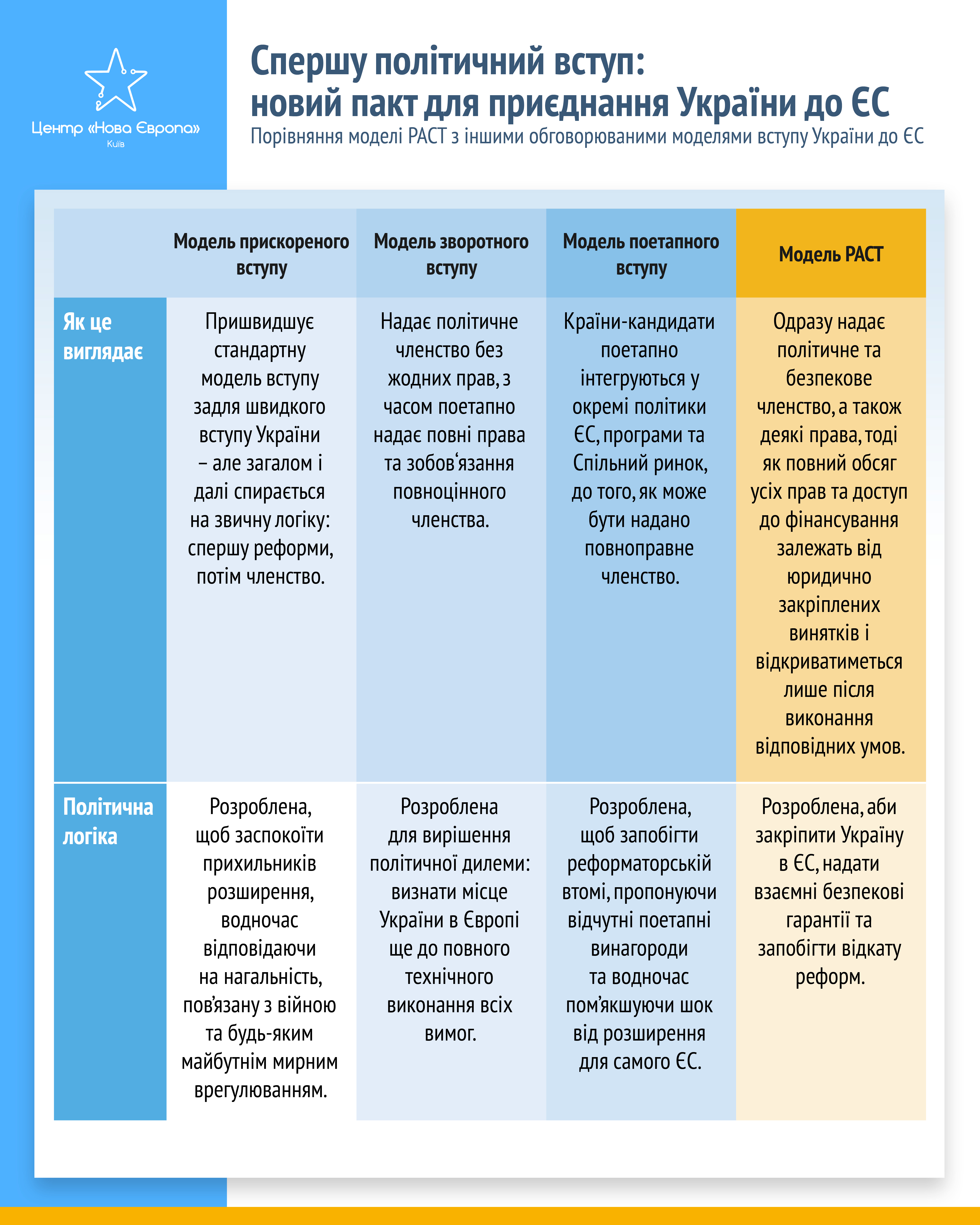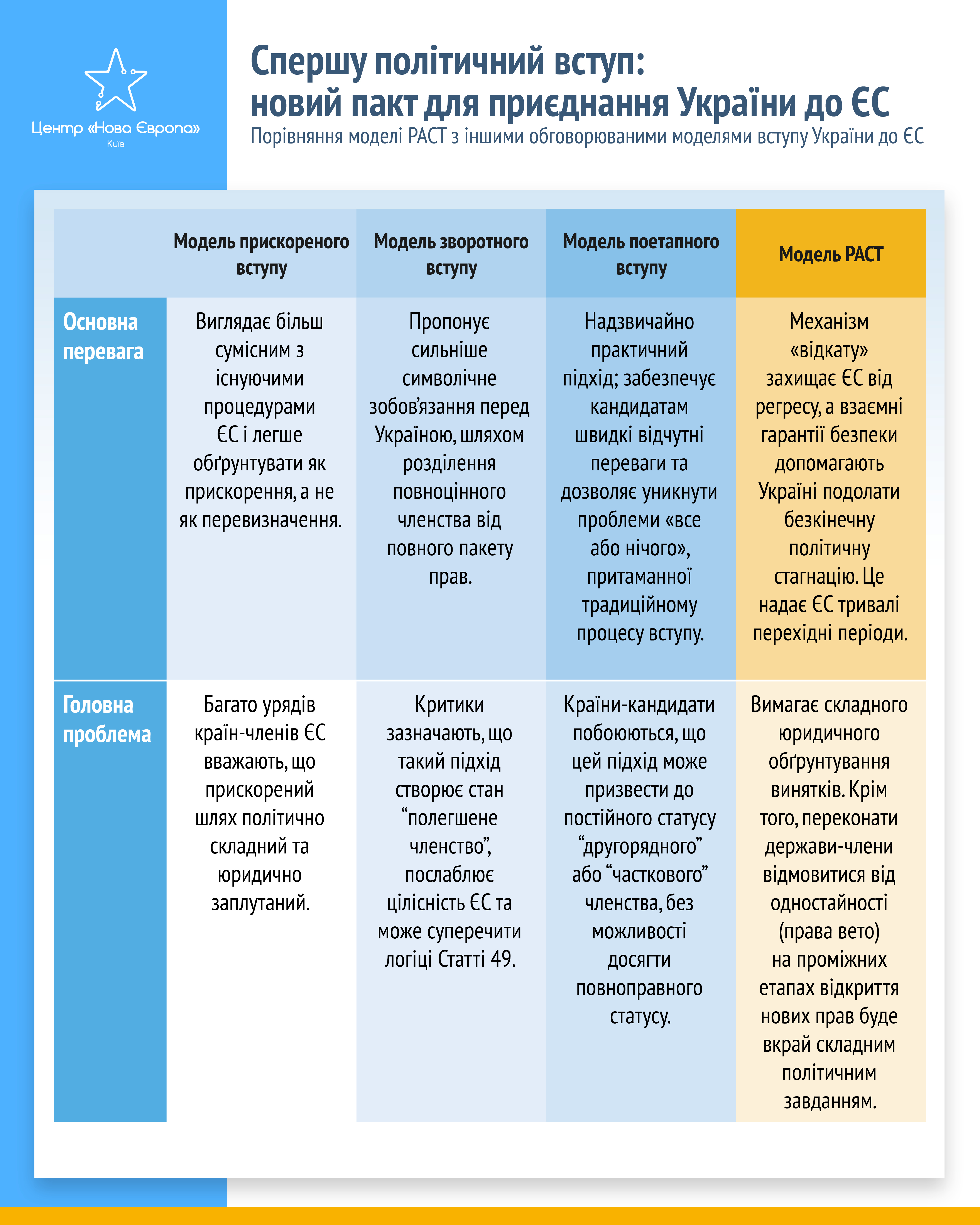 • Порівняно з моделлю прискореного вступу (fast-track), яка фактично відкладає приєднання до моменту завершення усіх реформ, PACT надає негайне політичне членство.