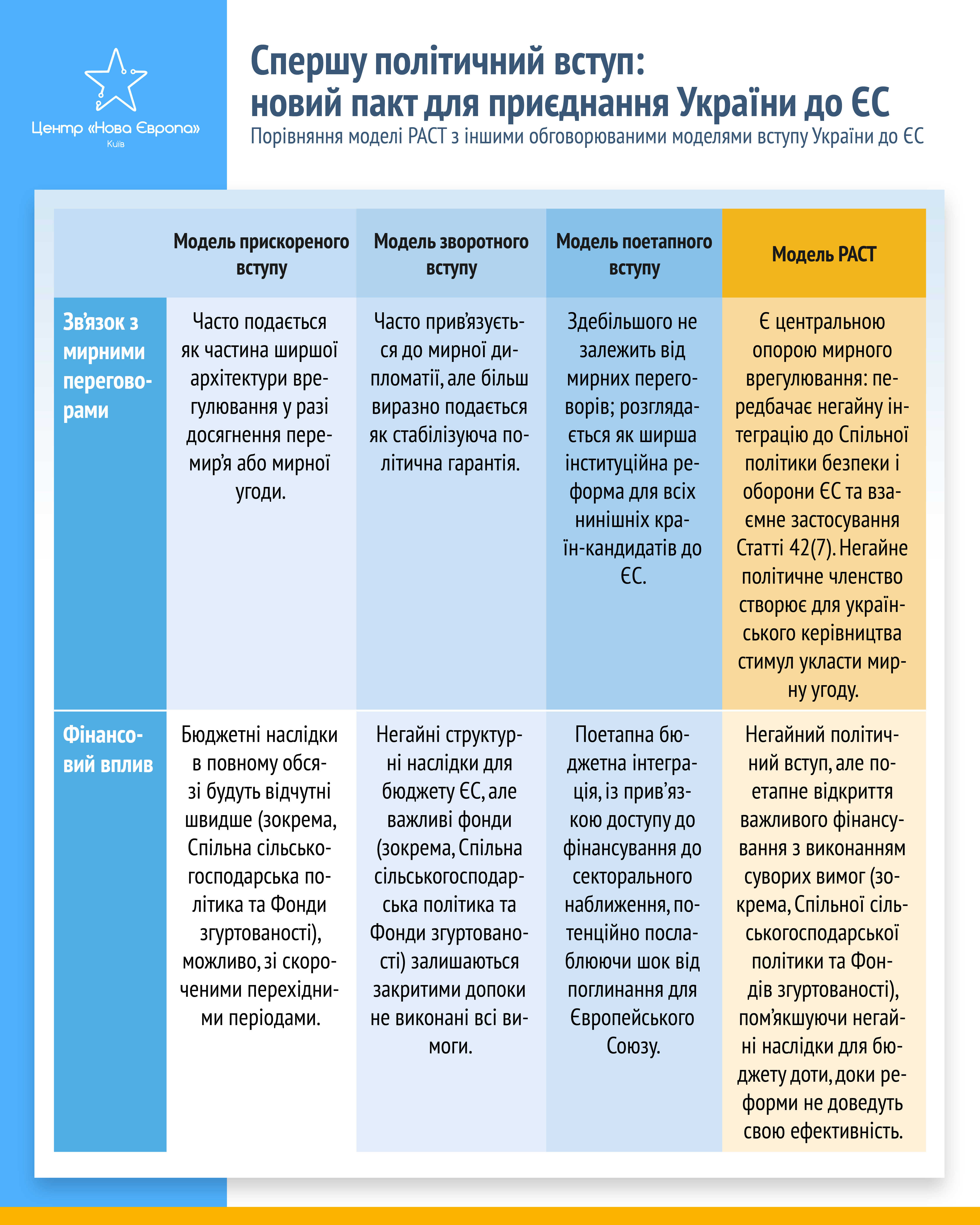 • На відміну від зворотного вступу (reverse accession), PACT зосереджується винятково на кластері “основи”, запобіжниках та перехідних періодах щодо доступу до фінансування. Вона краще враховує занепокоєння держав-членів, зокрема щодо того, чи отримає Україна доступ до значної частини бюджету Спільної сільськогосподарської політики.