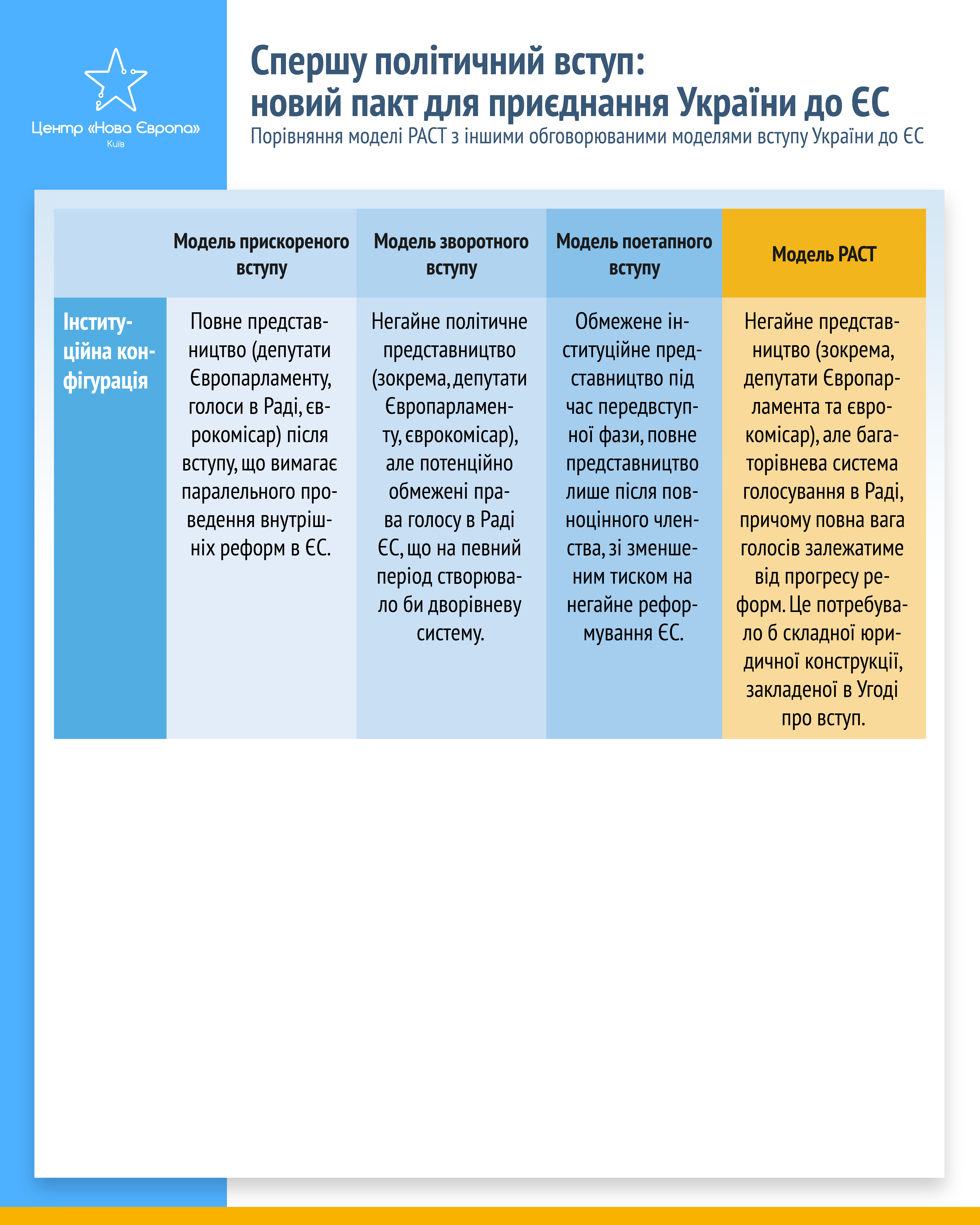 • Порівняно з моделлю поступового членства (gradual accession), Україна гарантовано отримає членство; питання буде лише в тому, наскільки швидко країна може виконати реформи, аби отримати відповідні права та повноваження.