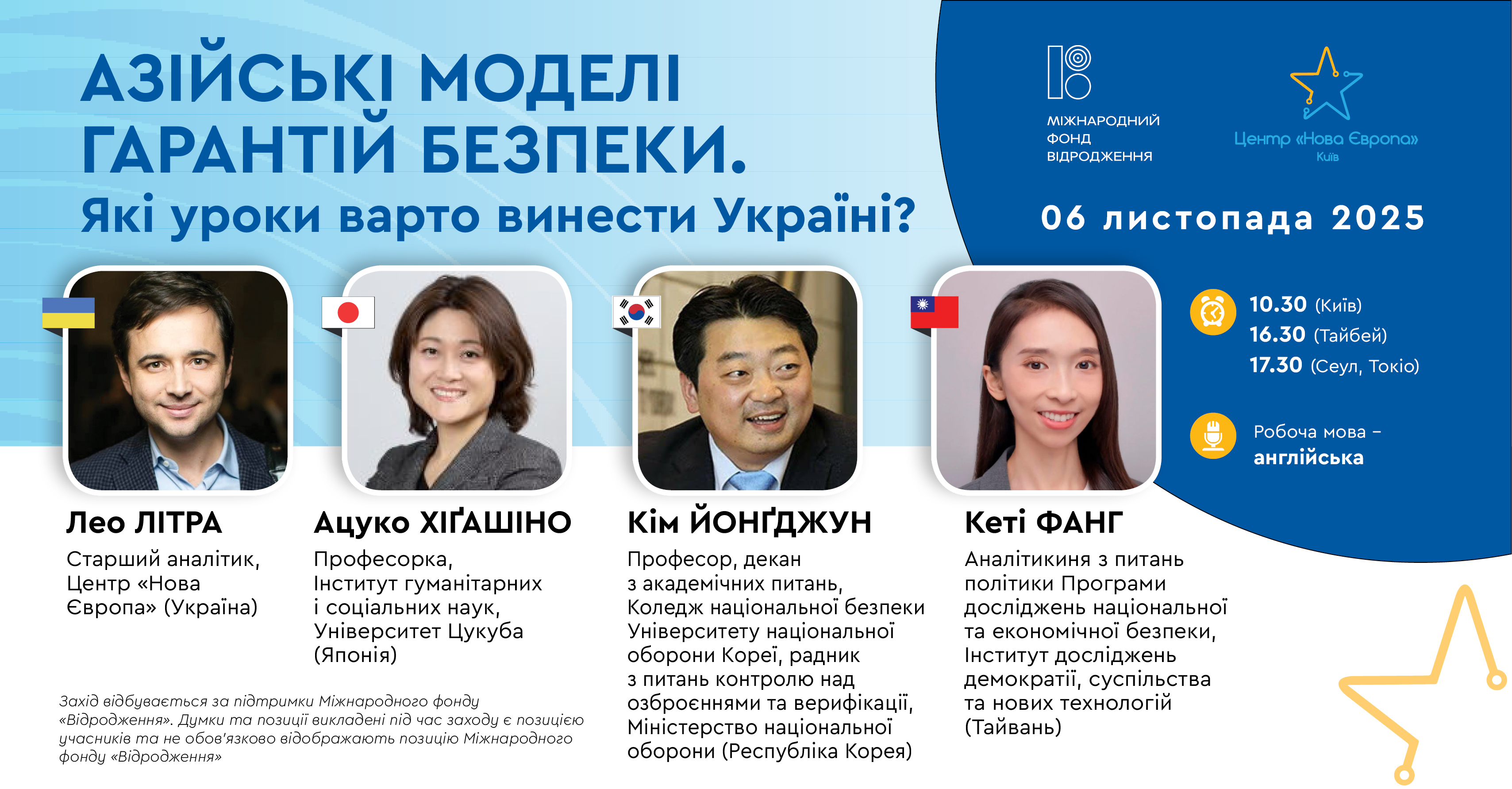 Під час обговорення експерти з України, Японії, Південної Кореї та Тайваню розглянуть питання ефективності союзницьких форматів, автономного розвитку оборонних спроможностей, а також уроків, які може винести Україна для побудови власної системи гарантій безпеки.