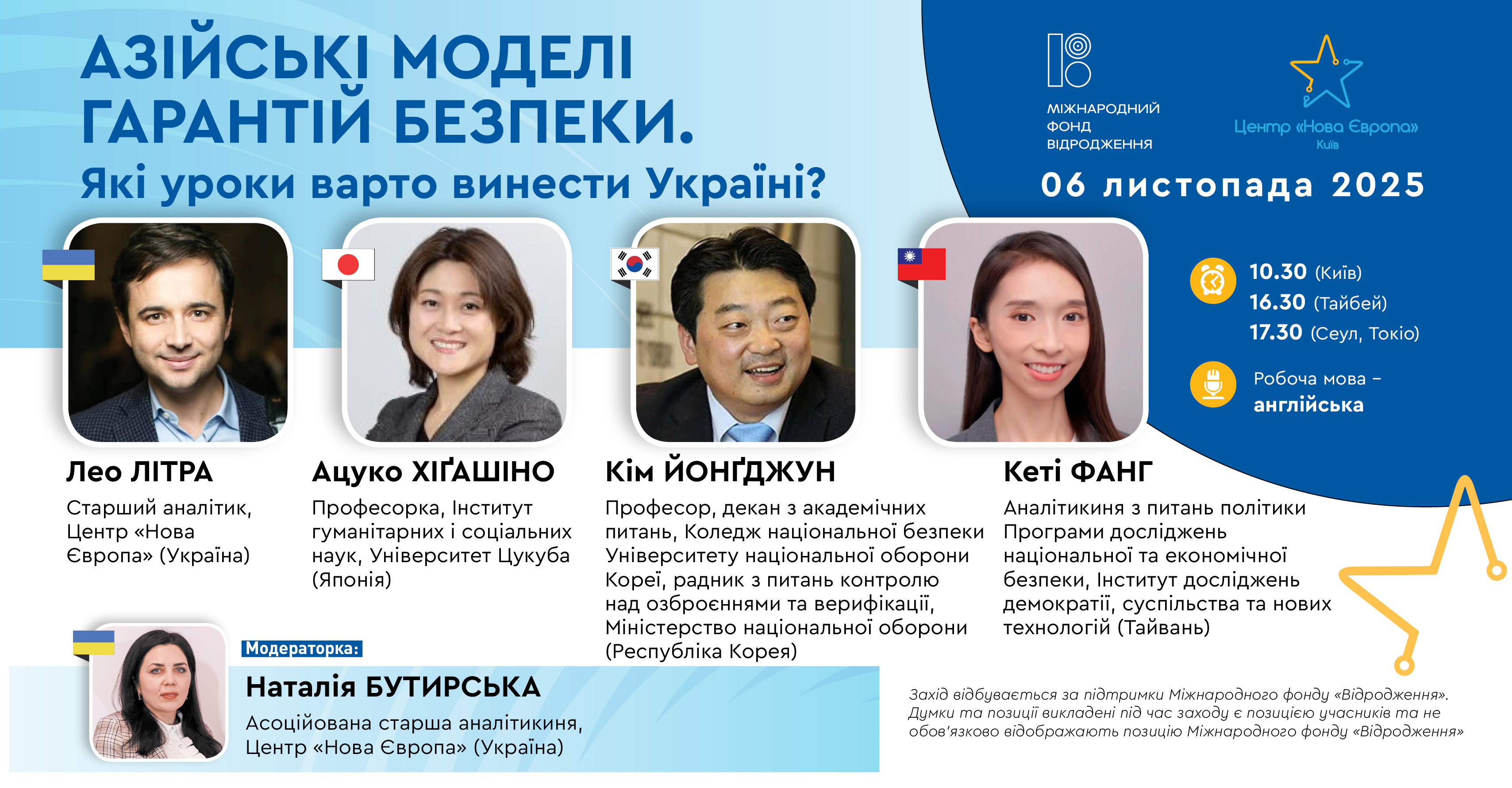 Центр «Нова Європа» запрошує долучитися до онлайн-дискусії «Азійські моделі гарантій безпеки: які уроки варто винести Україні?», присвяченої аналізу досвіду країн Східної Азії у забезпеченні національної безпеки в умовах постійних загроз.