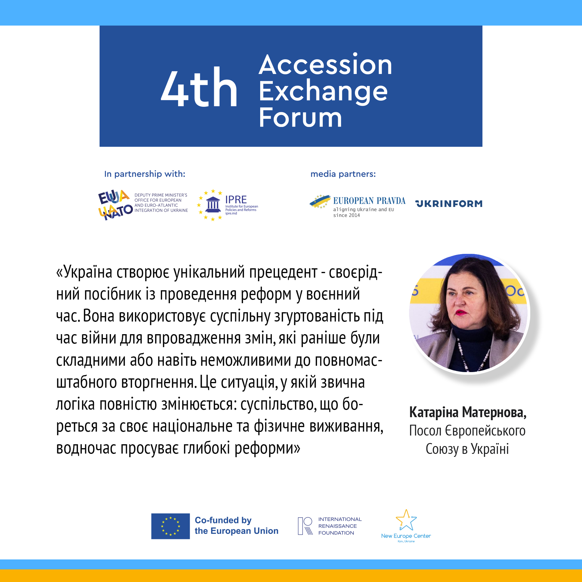 Під час Четвертого EU Accession Exchange Forum Посол Європейського Союзу в Україні Катаріна Матернова наголосила, що процес вступу України до ЄС є не лише технічним чи політичним викликом, а історичною місією — як для України, так і для всієї Європи. Вона відзначила значний прогрес України у впровадженні реформ попри повномасштабну війну, закликала до єдності та стратегічної сміливості в Європі й підкреслила, що допомога Україні в її перемозі є ключем до тривалого миру на континенті.