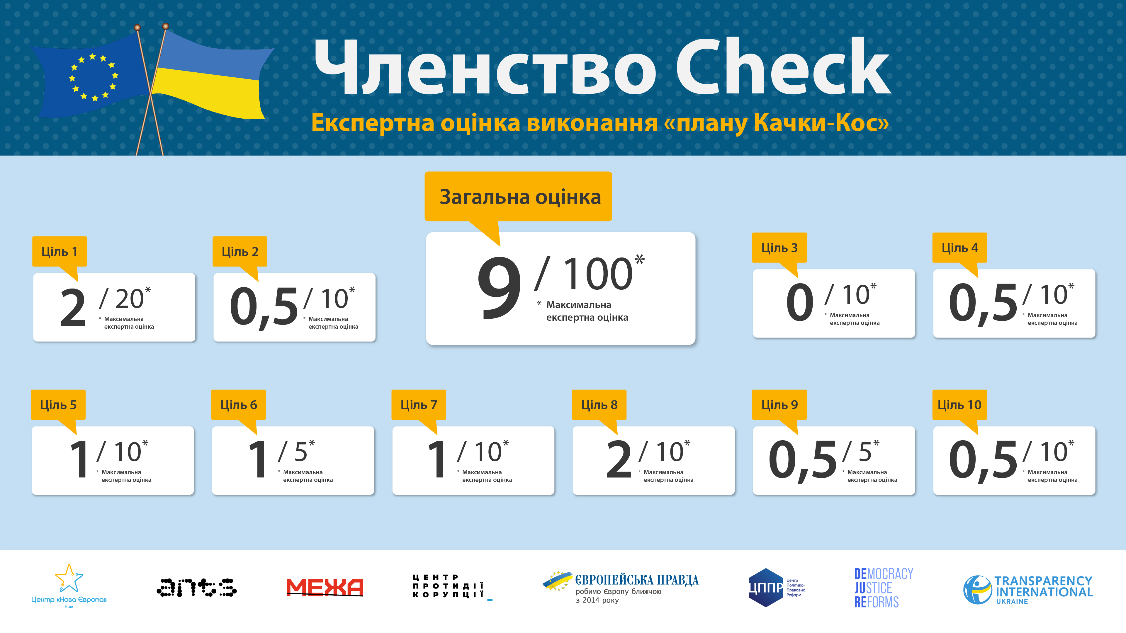 Мета цього експертного моніторингу – сприяння успішному просуванню України до членства в Європейському Союзі через незалежну оцінку виконання ключових реформ. Своєчасне та якісне виконання зобов’язань демонструватиме здатність України впроваджувати системні зміни. Незалежна позитивна оцінка дозволятиме переконливіше розвіювати побоювання серед політиків, експертних кіл та пересічних громадян країн-членів ЄС, доводячи, що Україна впроваджує необхідні реформи на шляху до Європейського Союзу, насамперед у сфері верховенства права та боротьби з корупцією. Водночас ми виходимо з переконання, що євроінтеграційні реформи потрібні насамперед самим українцям.