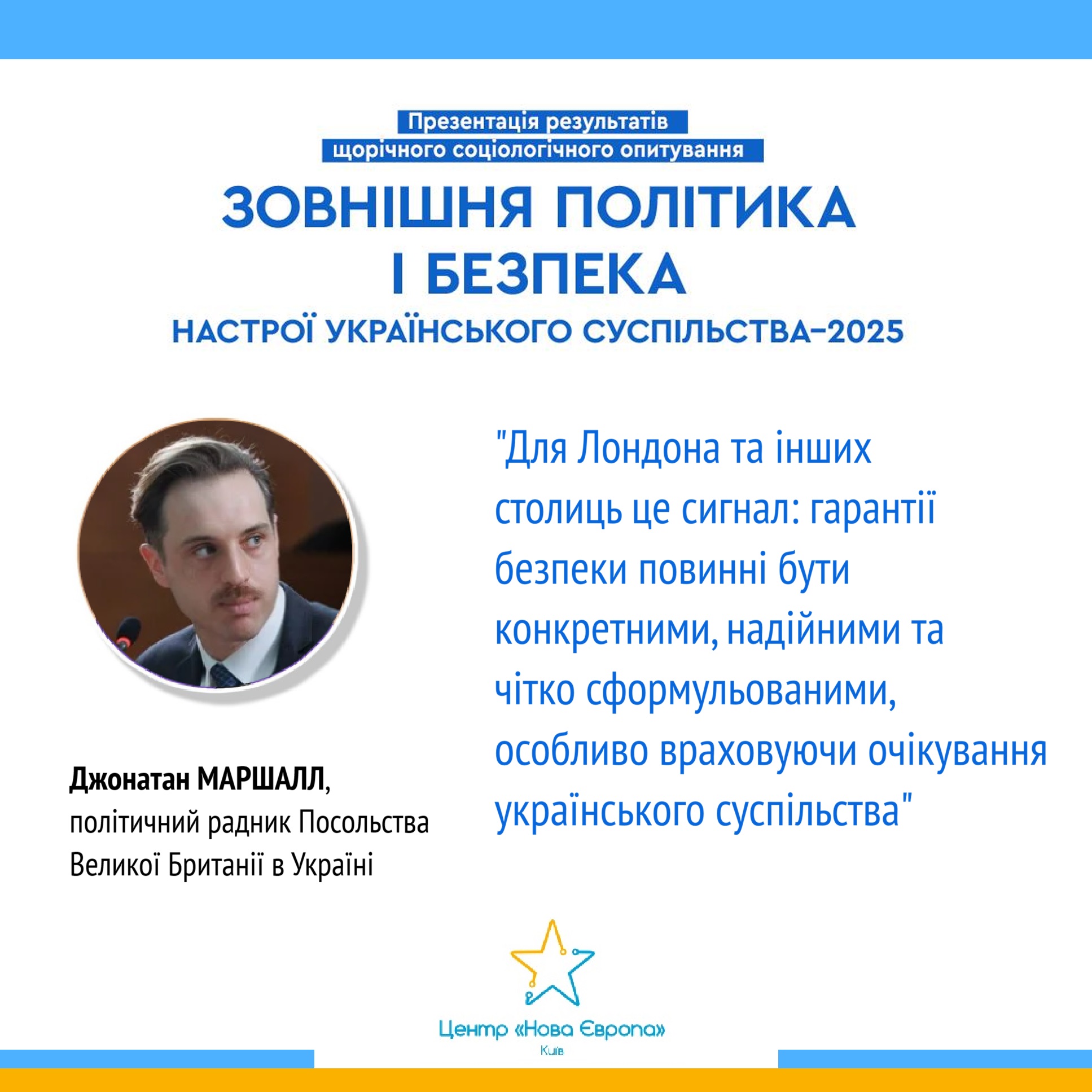 Джонатан Маршалл, політичний радник Посольства Великої Британії в Україні, у своєму виступі під час презентації нещодавнього соціологічного опитування зосередив увагу на важливості розуміння громадської думки українців, а не лише позицій політичної еліти, при формуванні зовнішньої політики та підтримці України. Він підкреслив міцну відданість українців боротьбі з корупцією, значущість довіри до інституцій та міжнародних партнерів, а також критичну потребу в конкретних і надійних гарантіях безпеки, включно з підтримкою НАТО, у контексті триваючої війни та довгострокового миру: