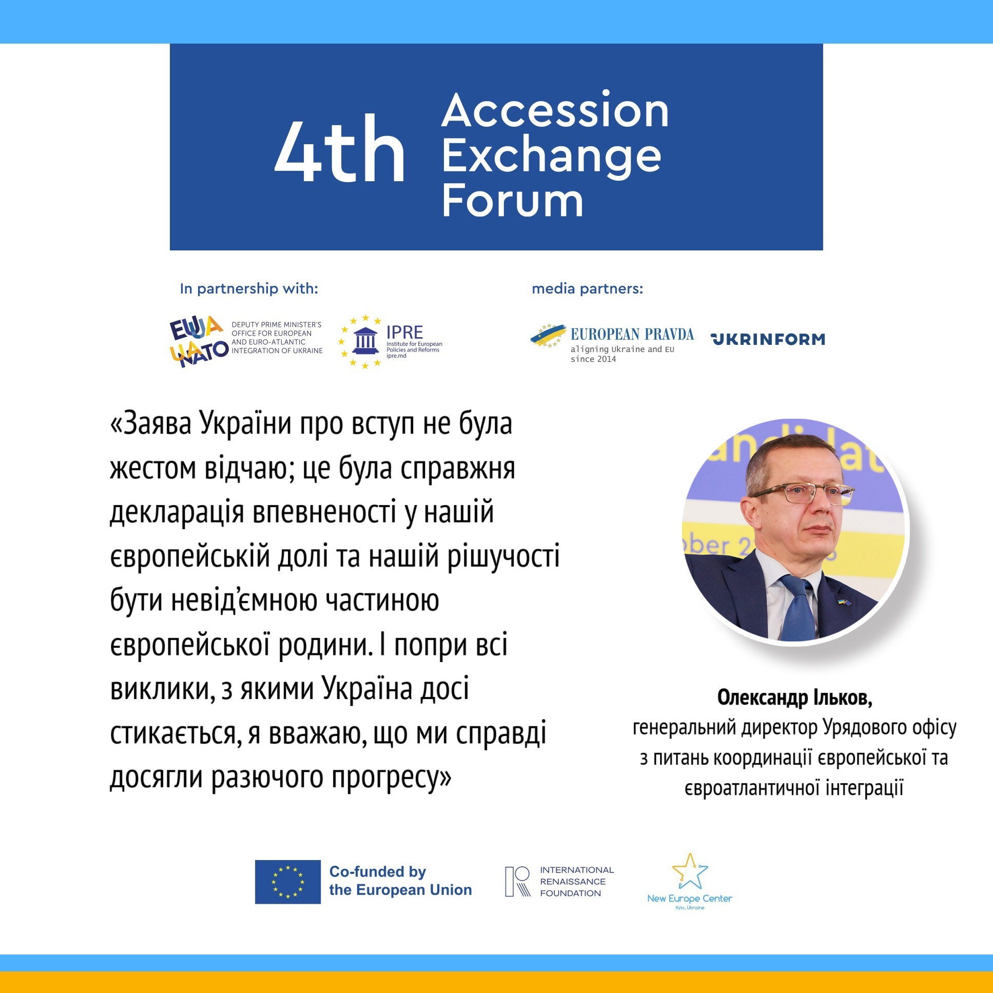 Олександр Ільков, Генеральний директор Урядового офісу з питань координації європейської та євроатлантичної інтеграції, на Четвертому EU Accession Exchange Forum заявив, що саме Україна є тим чинником, який змінив правила гри: саме вона вдихнула нове життя в політику розширення ЄС і перетворила її з далекої мрії на живий і динамічний процес.
