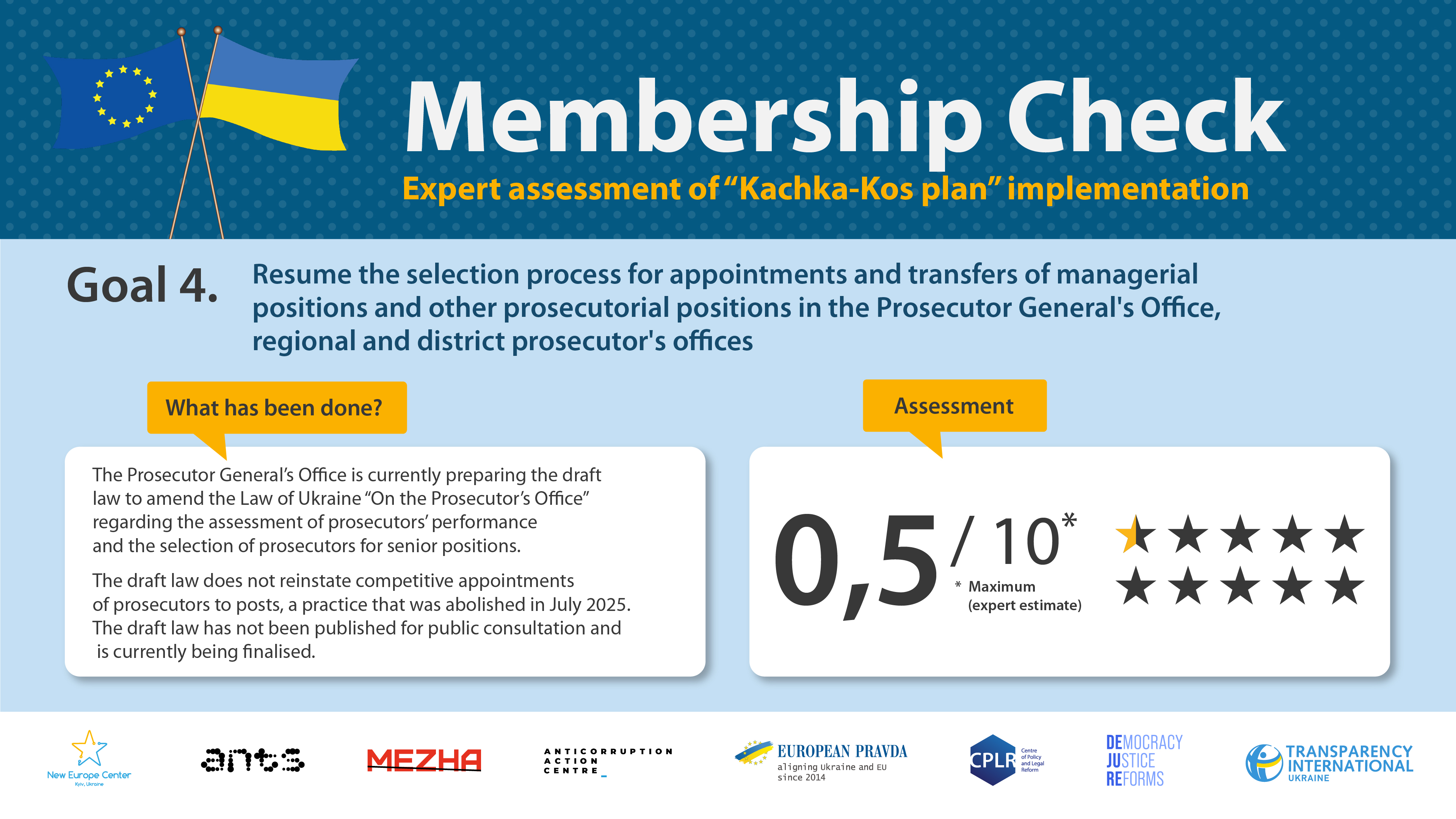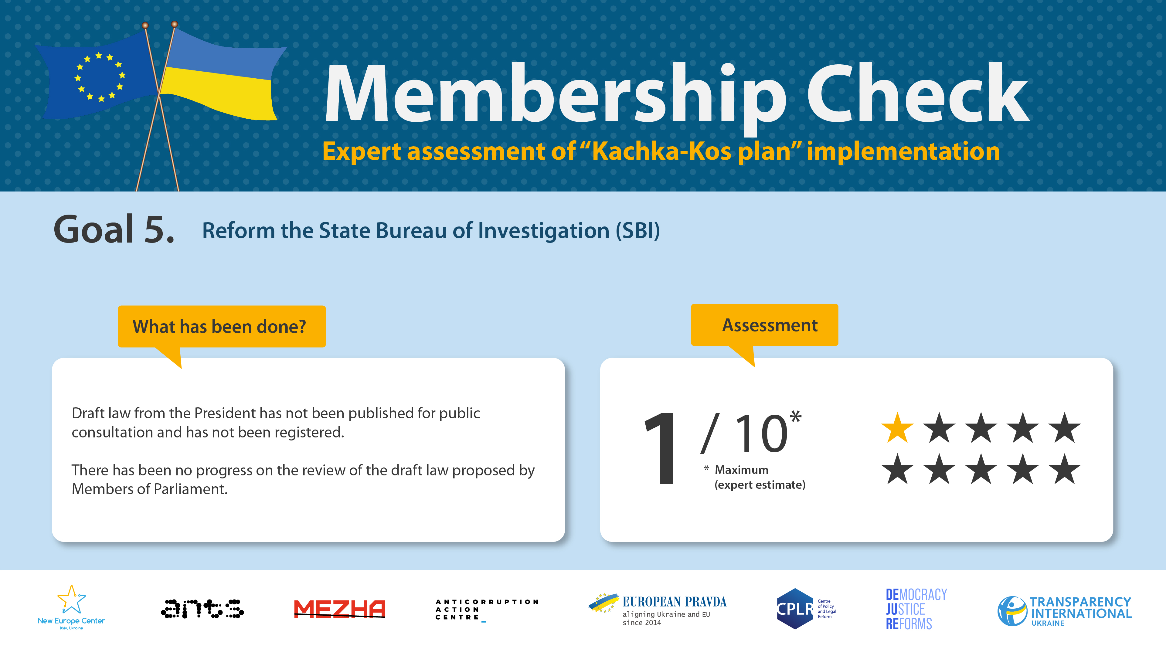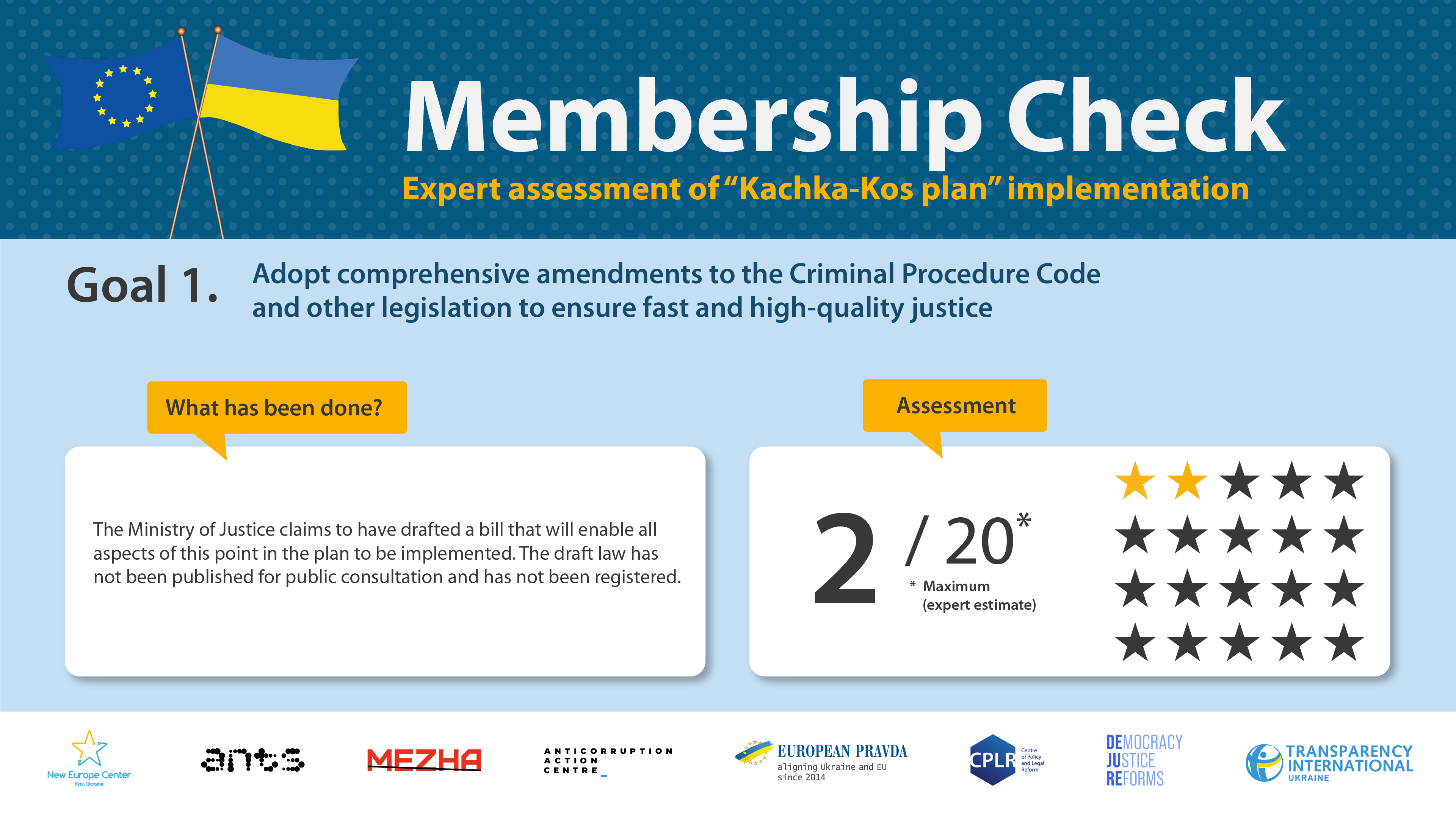 At the same time, the expert coalition leaves the possibility of expanding the monitoring via other topics and benchmarks, in case they become critical for the European integration process of Ukraine, as well as declares its intention to continue monitoring other documents setting out reforms in this area – once Ukraine has implemented the “Kachka–Kos plan” or even before the completion of its implementation.