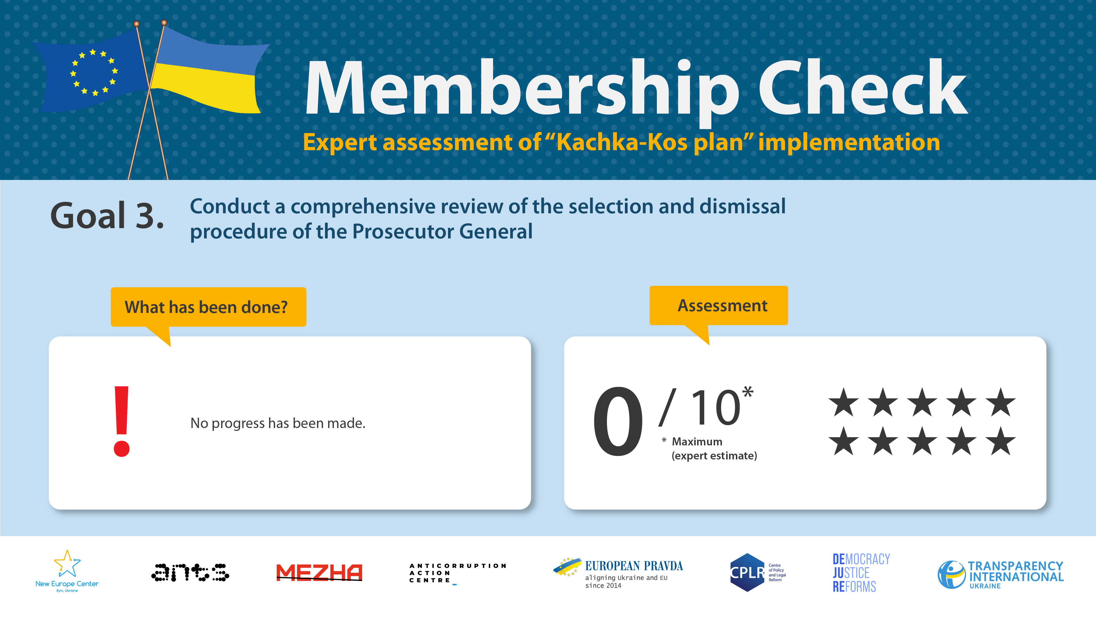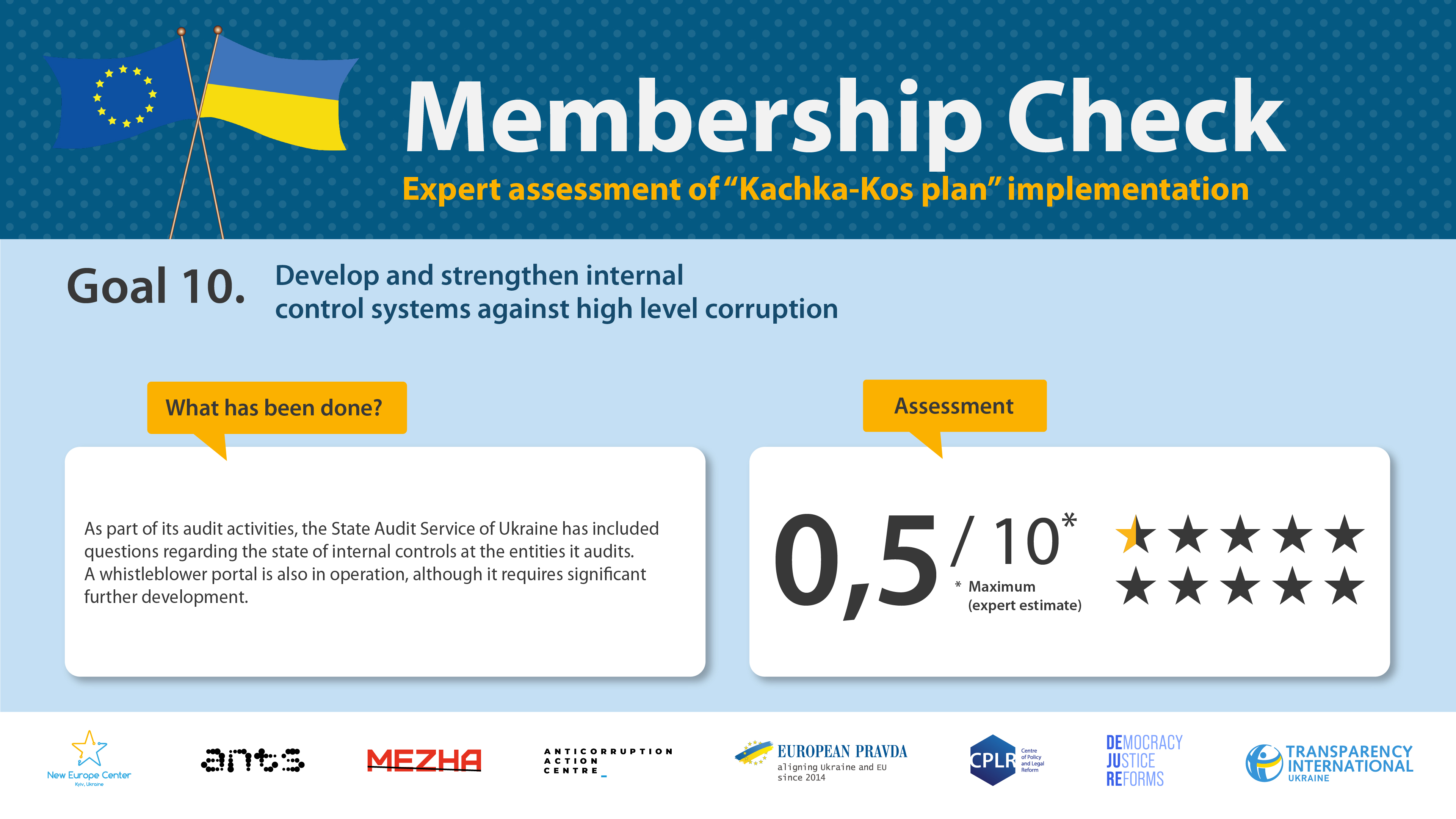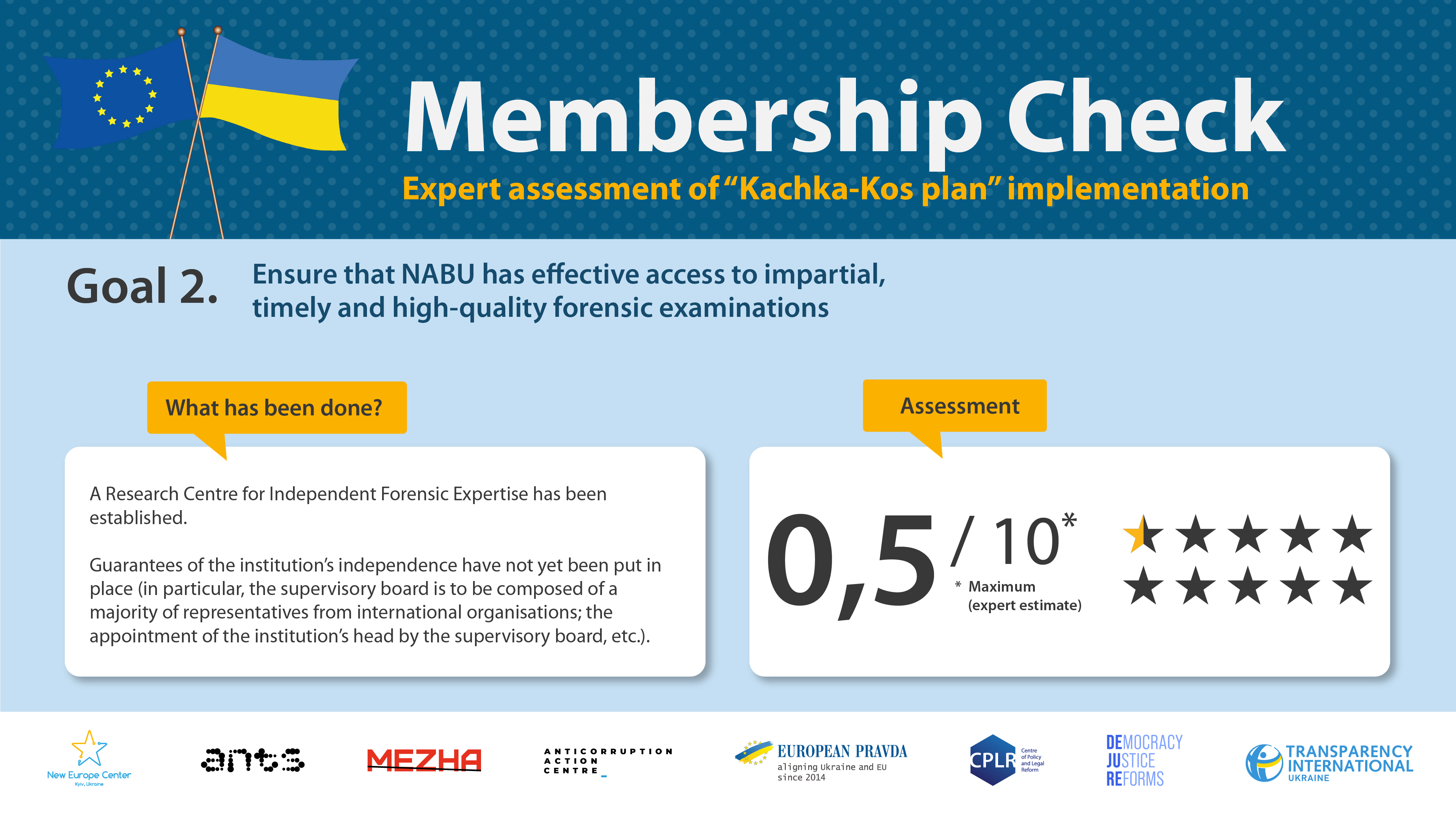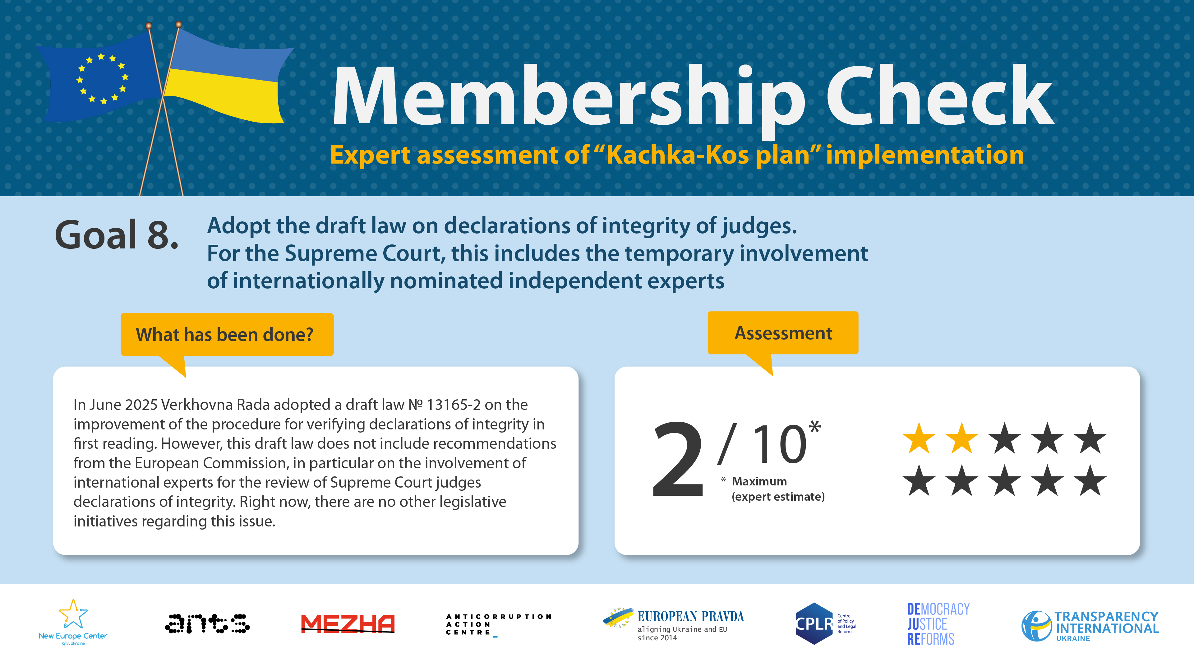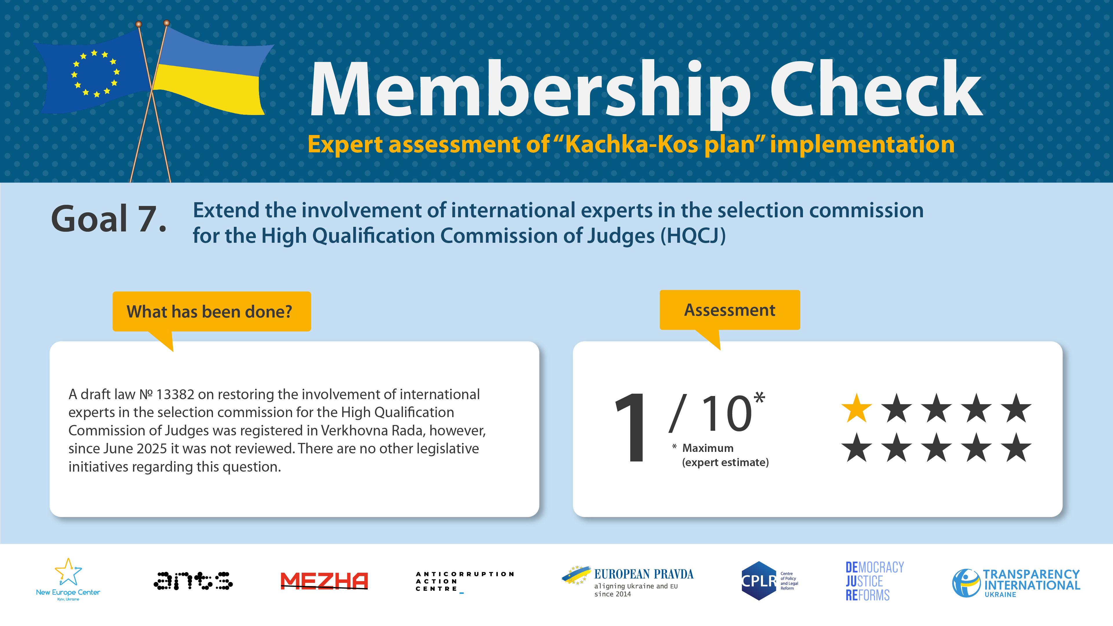 The goal of this expert monitoring is to to support Ukraine’s successful progress towards European Union membership through an independent assessment of the implementation of key reforms. Timely and efficient fulfilling of these commitments will demonstrate Ukraine’s ability to implement systemic changes. An independent positive assessment will help to dispel existing concerns among EU politicians, experts and citizens more convincingly, proving that Ukraine is implementing the necessary reforms on its path to the European Union, particularly in the areas of the rule of law and the fight against corruption. At the same time, we are convinced that European integration reforms are needed first and foremost by the Ukrainian people themselves.
