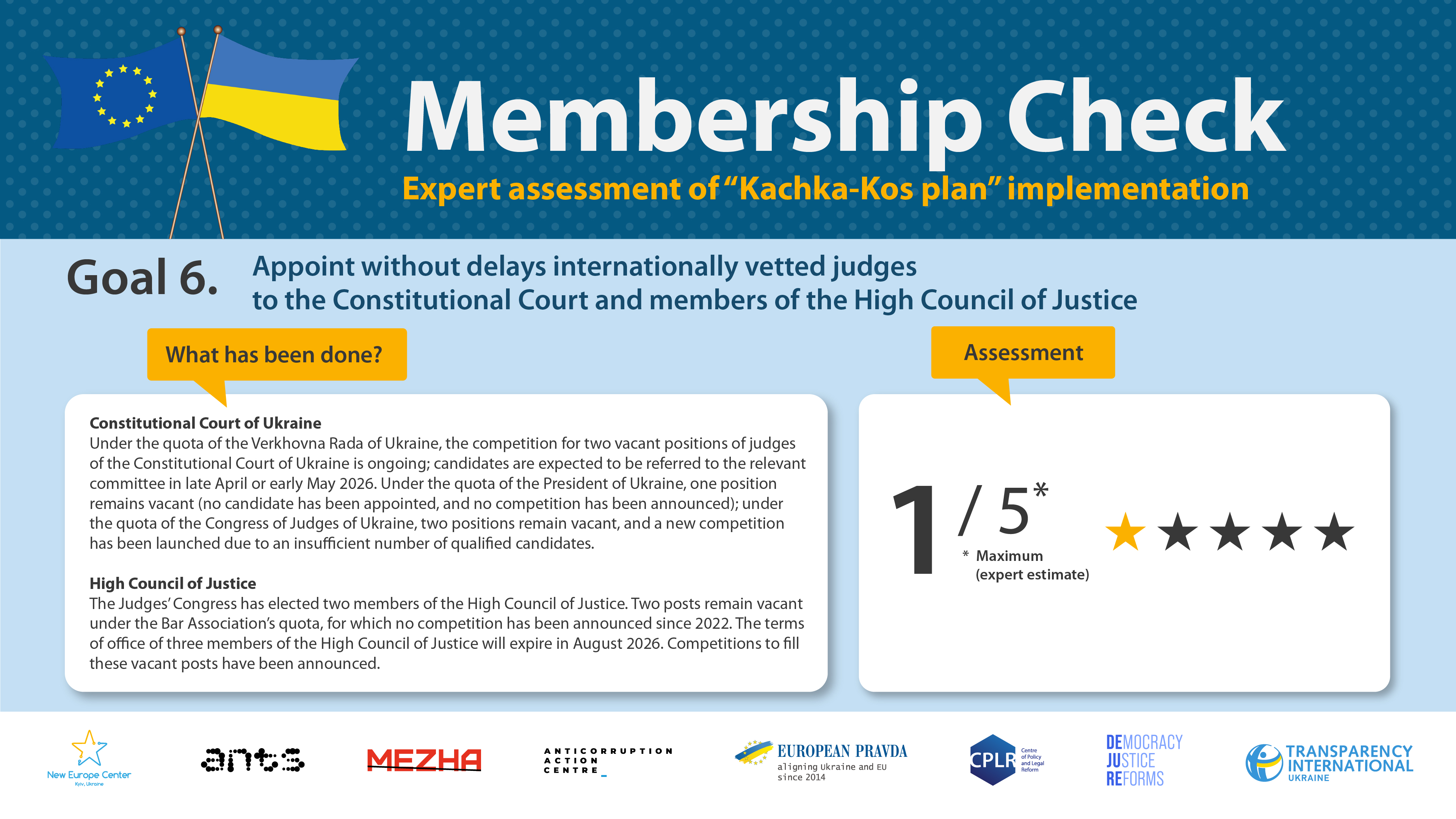 - Announcement by April 2026 of a competition for 1 vacant position of a Constitutional Court judge under the quota of the President of Ukraine, or appointment of a candidate recommended by the AGE and the selection commission in the first half of 2025.