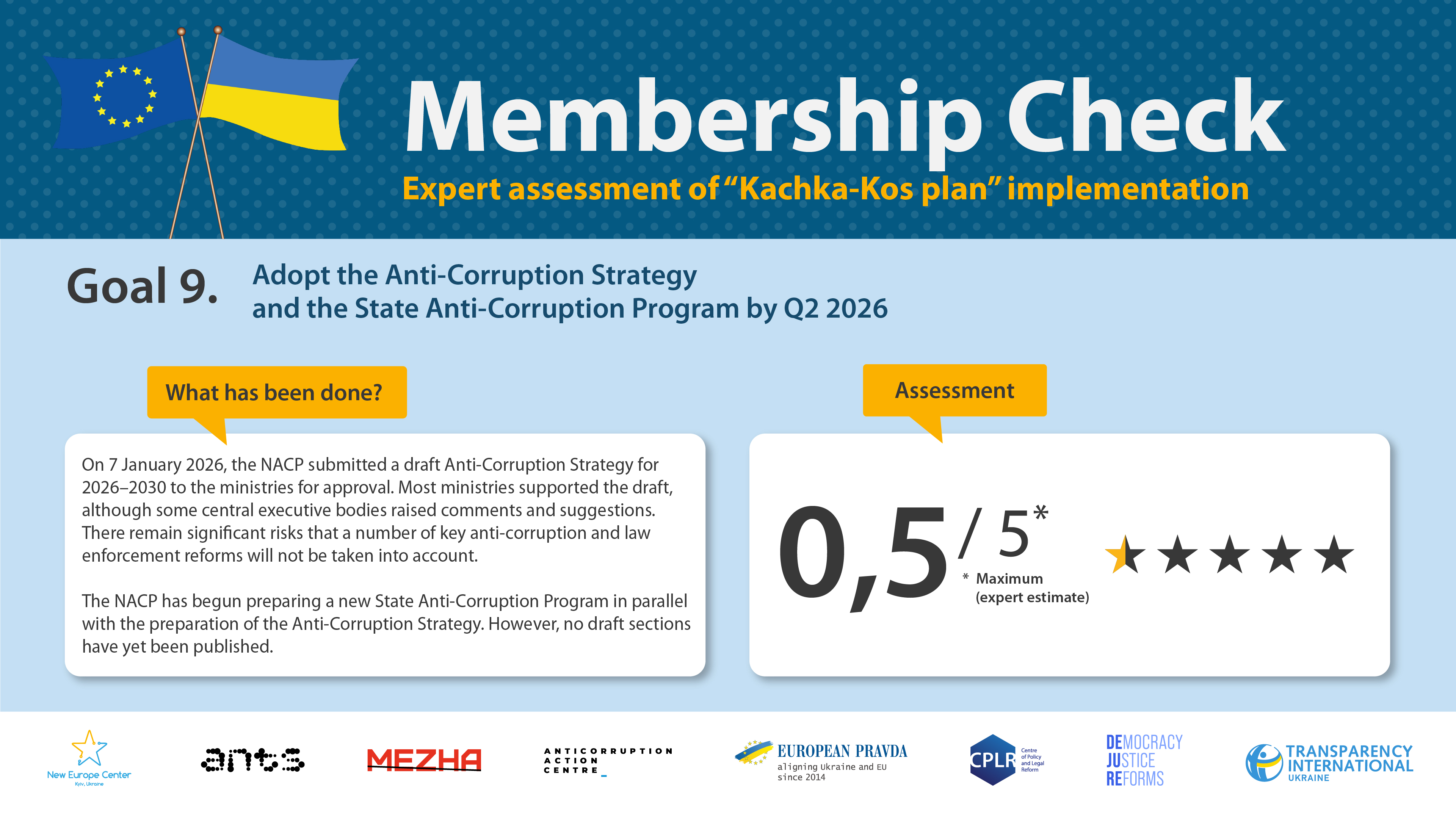 This initiative is based on the former experience of independent monitoring of European integration reforms. In June 2022 Ukraine received the candidate country status, together with 7 recommendations from the European Commission, which were necessary for further progress towards membership. As a response, New Europe Center, together with the coalition of leading think tanks and civil society organizations initiated “Candidate Check” – independent expert monitoring of recommendations’ implementation. The initiative proved itself as a useful tool for public oversight of the fulfilment of European integration commitments. The current monitoring exercise continues this tradition: the key organisations involved in ‘Candidate Check’ are also participating in the new ‘Membership Check’ assessment phase.