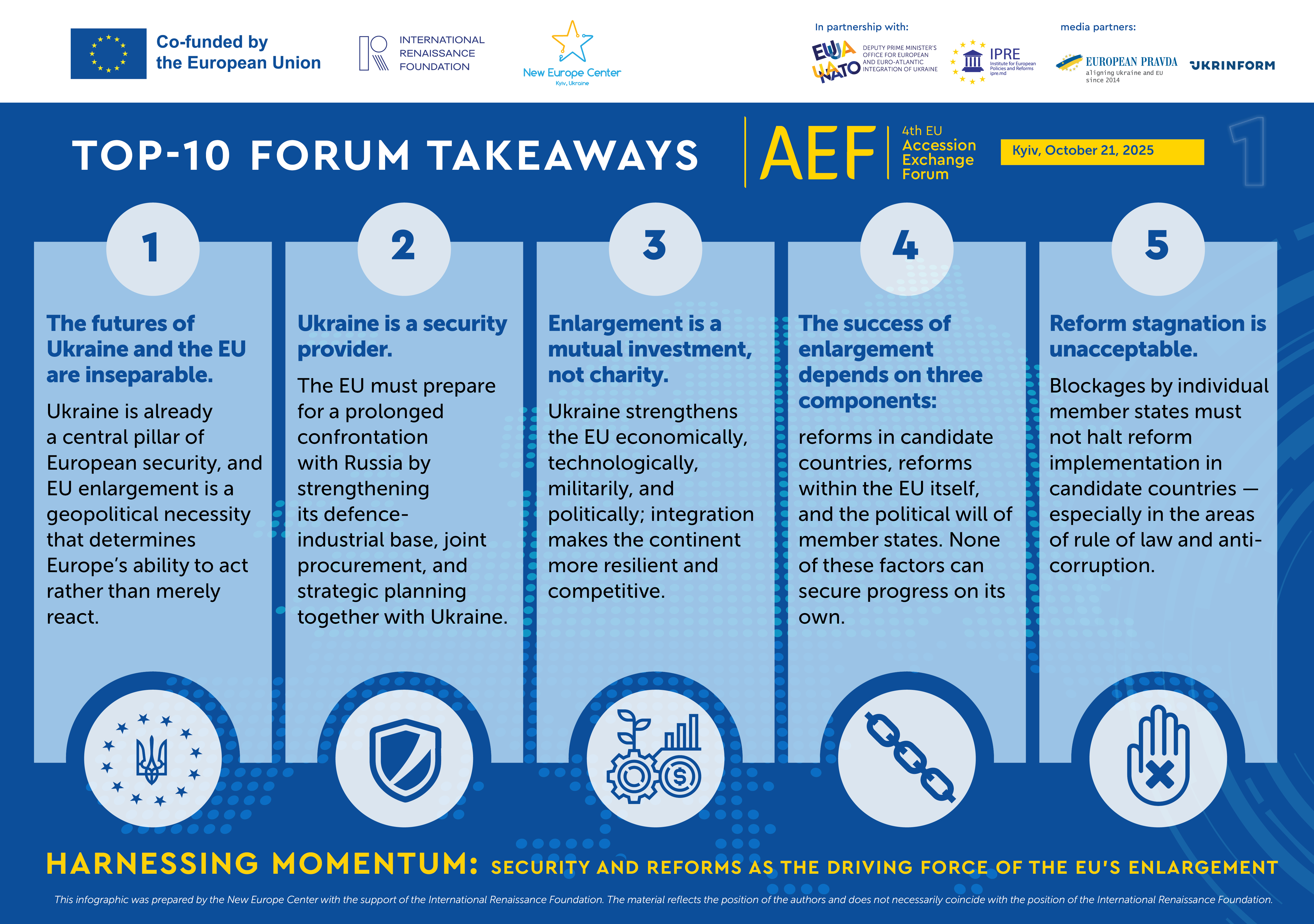 The EU Accession Exchange Forum is organized by the New Europe Center in partnership with the Office of the Deputy Prime Minister for European and Euro-Atlantic Integration of Ukraine, the International Renaissance Foundation, and the Institute for European Policies and Reforms (Republic of Moldova), with Ukrinform and European Pravda serving as media partners. The EU Accession Exchange Forum is taking place with EU support, within the EU-funded “Whole-of-Society Accession” project implemented by the International Renaissance Foundation.