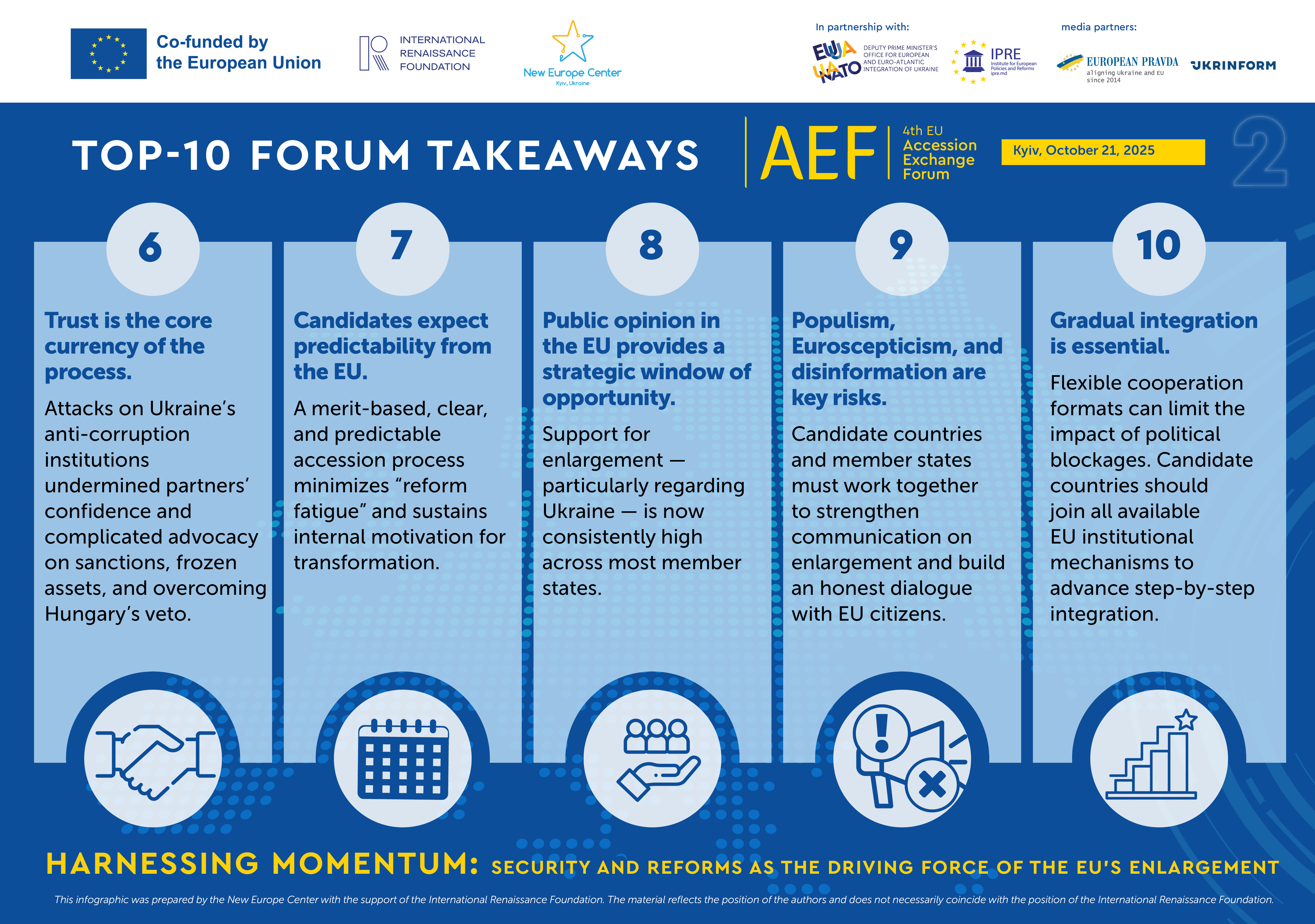 The European Union is increasingly aware of its own geopolitical weight and responsibility. This transformation requires discussing not only reforms in candidate countries, but also internal changes within the EU itself. During the annual EU Accession Exchange Forum, organized by the New Europe Center, experts from member states and candidate countries had the opportunity to examine the key questions and challenges facing both national governments and European institutions in the context of future enlargement. This analytical report presents the main insights and recommendations developed on the basis of discussions among government representatives, as well as leading foreign and Ukrainian experts and diplomats.