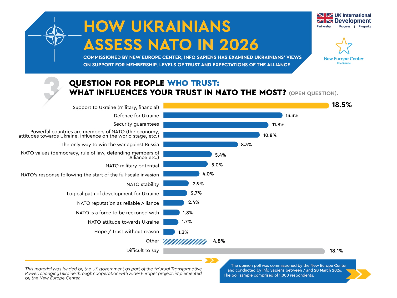 An Alliance of support and security. Public trust in NATO in Ukraine largely depends on the practical assistance provided by the Alliance. At the same time, positive perceptions are also shaped by viewing the North Atlantic Treaty Organization as a powerful security bloc – a force to be reckoned with. The New Europe Center asked Ukrainians who trust NATO an open-ended question (without suggested answer options): what most influences your trust? The top three factors were: “support to Ukraine” (18.5%), “defence for Ukraine” (13.3%), and “security guarantees” (11.8%). Other factors included: “powerful countries are members of NATO” (10.8%), “the only way to win the war against Russia” (8.3%), “NATO values” (5.4%), and “NATO military potential” (5.0%), among others. As we can see, the responses can be grouped into two main clusters – support for Ukraine and a high assessment of NATO’s capabilities. The response “security guarantees” to some extent bridges these two approaches. Ukrainians trust NATO because it guarantees security to its members (i.e., trust in the strength of the Alliance: “NATO members are not attacked”), but respondents also recognize that the Alliance could protect Ukraine from Russian aggression – reflecting a clear expectation of direct protection (“if we were in NATO, Russia would not have attacked,” “protection from Russia,” “it can provide guarantees for Ukraine’s security”).
