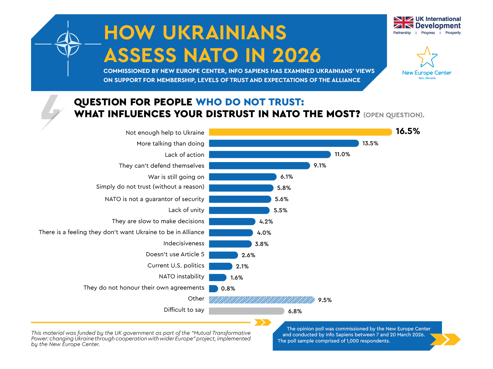 Distrust due to inaction. Ukrainians primarily distrust NATO because of how they assess its behavior during the war: the Alliance is perceived as doing too little, acting slowly, and lacking decisiveness. Responses to the open-ended question about the reasons for distrust included: “not enough help to Ukraine” (16.5%), “more talking than doing” (13.5%), “lack of action” (11.0%), “they can’t defend themselves” (9.1%), and “the war is still ongoing” (6.1%) – these are the five most frequently cited reasons. Most of these explanations relate to NATO’s policy toward Ukraine; however, some responses referred to NATO itself – its “instability,” the fact that the Alliance “doesn’t use Article 5,” as well as “current U.S. politics.” At the same time, a portion of Ukrainians admitted that they “simply do not trust” without a specific reason (almost 6%).