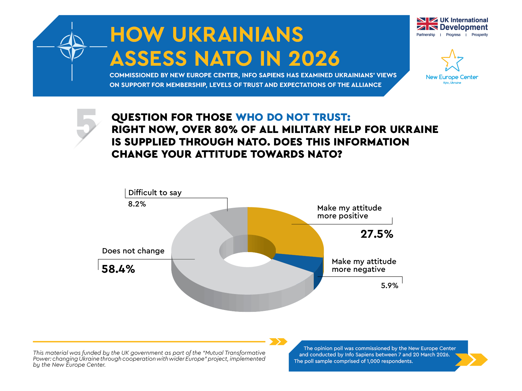 Sociological experiment. The New Europe Center asked an experimental question to the more than 40% of respondents who do not trust NATO: “Right now, over 80% of all military help for Ukraine is supplied through NATO. Does this information change your attitude towards NATO?” More than a quarter (27.5%) of Ukrainians responded that yes, it does – this fact makes their attitude toward the Alliance more positive. This suggests that a lack of awareness influences a portion of respondents. If we add this share of respondents who are willing to change their opinion to those who already trust NATO, the total would exceed 65%. This is roughly the same level of trust in the Alliance observed in Ukraine in November 2024 (64.4%). At the same time, the share of those unaffected by this information remains significant: 58.4% of respondents from the group that does not trust NATO said they would not change their opinion. Taking into account respondents’ explanations for their distrust, one possible hypothesis is that the mere fact of military assistance is not sufficient to restore trust – the timeliness and speed of support also matter (“if they had helped us in the first days of the war”). Many Ukrainians linked their distrust to the fact that “the war is still going on”; accordingly, regardless of the scale of weapons deliveries, the key indicator for this group remains the cessation of Russian aggression. One response that captures this public sentiment is: “minimum help: enough to keep us from dying, but not enough to let us win.” Another possible hypothesis is that media discussions about the insufficient capability and/or decisiveness of NATO countries to defend themselves – particularly in the event of an invasion of the Baltic states, especially under conditions of potential U.S. passivity or even withdrawal from NATO – contribute to these perceptions. As a result, some respondents question NATO’s “ability to defend itself.”