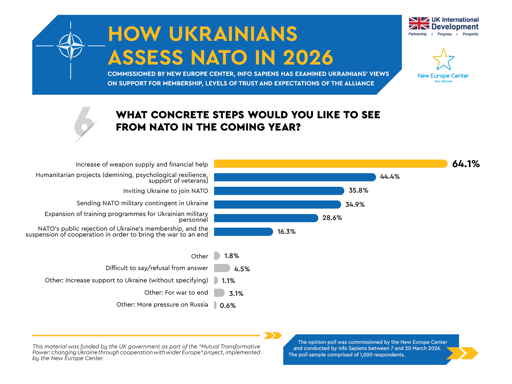 What concrete steps would you like to see from NATO in the coming year? 64.1% of respondents expect an increase in weapons supplies and financial assistance. At the same time, there is a strong demand for humanitarian initiatives – including demining, psychological resilience, and veteran support (44.4%) – which demonstrates that NATO is perceived not only as a military alliance, but also as a broader security instrument. More than one-third of respondents support extending an invitation for Ukraine to join NATO (35.8%) and deploying a NATO military contingent (34.9%). It can be assumed that these two figures would be significantly higher if Ukrainians believed these steps to be realistic, or if there were fewer doubts regarding the United States. Notably, the decline in trust in NATO coincided with the period when the issue of membership invitation disappeared from the public agenda (following the inauguration of the new U.S. president). This does not mean that Ukrainians themselves have abandoned the Euro-Atlantic perspective. On the contrary, the majority do not support the idea of NATO publicly rejecting Ukraine’s membership. Only 16.3% chose the option: “NATO’s public rejection of Ukraine’s membership, and the suspension of cooperation in order to bring the war to an end.”