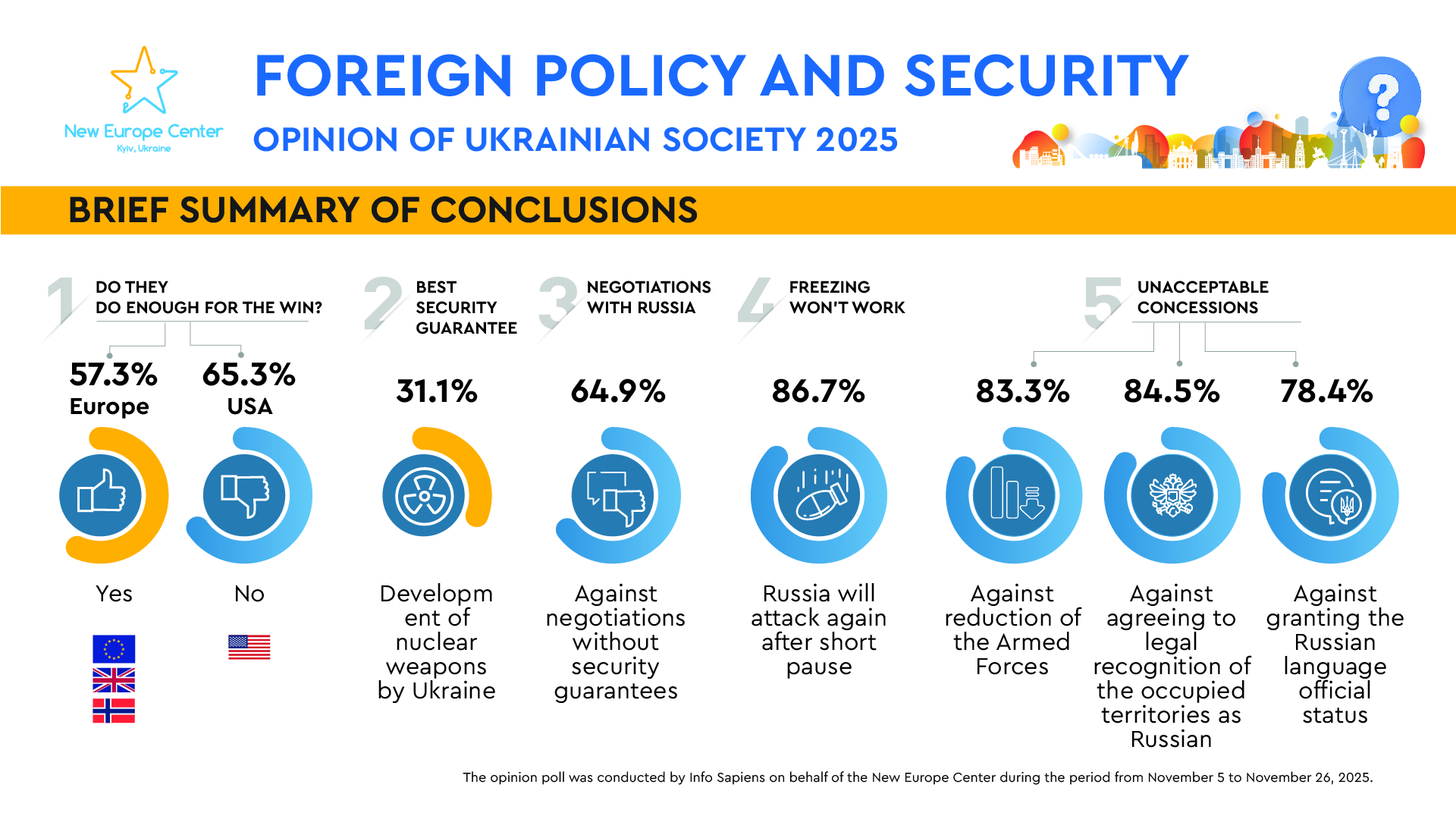 Ukrainian society remains unwavering in its conviction that negotiations without security guarantees are not a reliable path to peace, and that without external safeguards, any compromise will only postpone a new aggression by Russia.