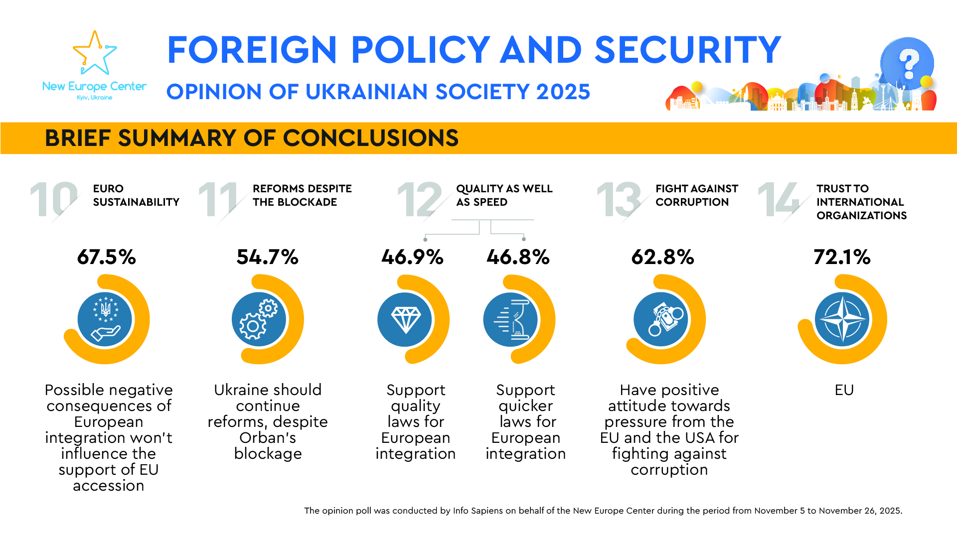 Europe is the favorite in terms of Ukrainian sympathies and trust. The strategic orientation of Ukrainian society is clear: the absolute majority of citizens support Ukraine’s membership in the EU and NATO. Ukrainians want to join the European Union so strongly that most are ready to withstand the possible negative consequences of preparing for EU membership – rising prices, additional regulations. Respondents demonstrate a rather targeted and nuanced view of international support. Among the leaders of public trust are the heads of Western European, Scandinavian, and Baltic states. Notably, this includes not only the leaders of EU member states but also those of other European countries that play an important role in the continent’s security initiatives. Respondents expressed particular respect for the leaders of the Coalition of the Willing – the United Kingdom, Germany, and France. For Ukrainians, it is extremely important to see Ukraine reformed, regardless of obstacles. In their view, Hungary’s blocking cannot be an excuse for slowing down European integration reforms. Successful European integration is associated above all with an effective fight against corruption and the rule of law. At the same time, Ukrainians do not perceive the EU as a reliable security guarantor. Society continues to prefer sovereign, autonomous approaches to guaranteeing its own security. Accordingly, among the proposed guarantees, respondents prioritized the development of nuclear weapons. At the same time, Ukrainians remain steadfast in the conviction that negotiations with the Russians without security guarantees are not a reliable path to peace. Every second Ukrainian is ready to join protests if Ukraine agrees to unacceptable compromises. Among the most unacceptable concessions are: reducing Ukraine’s army, legally recognizing the occupied territories as Russian, and granting the Russian language official status.