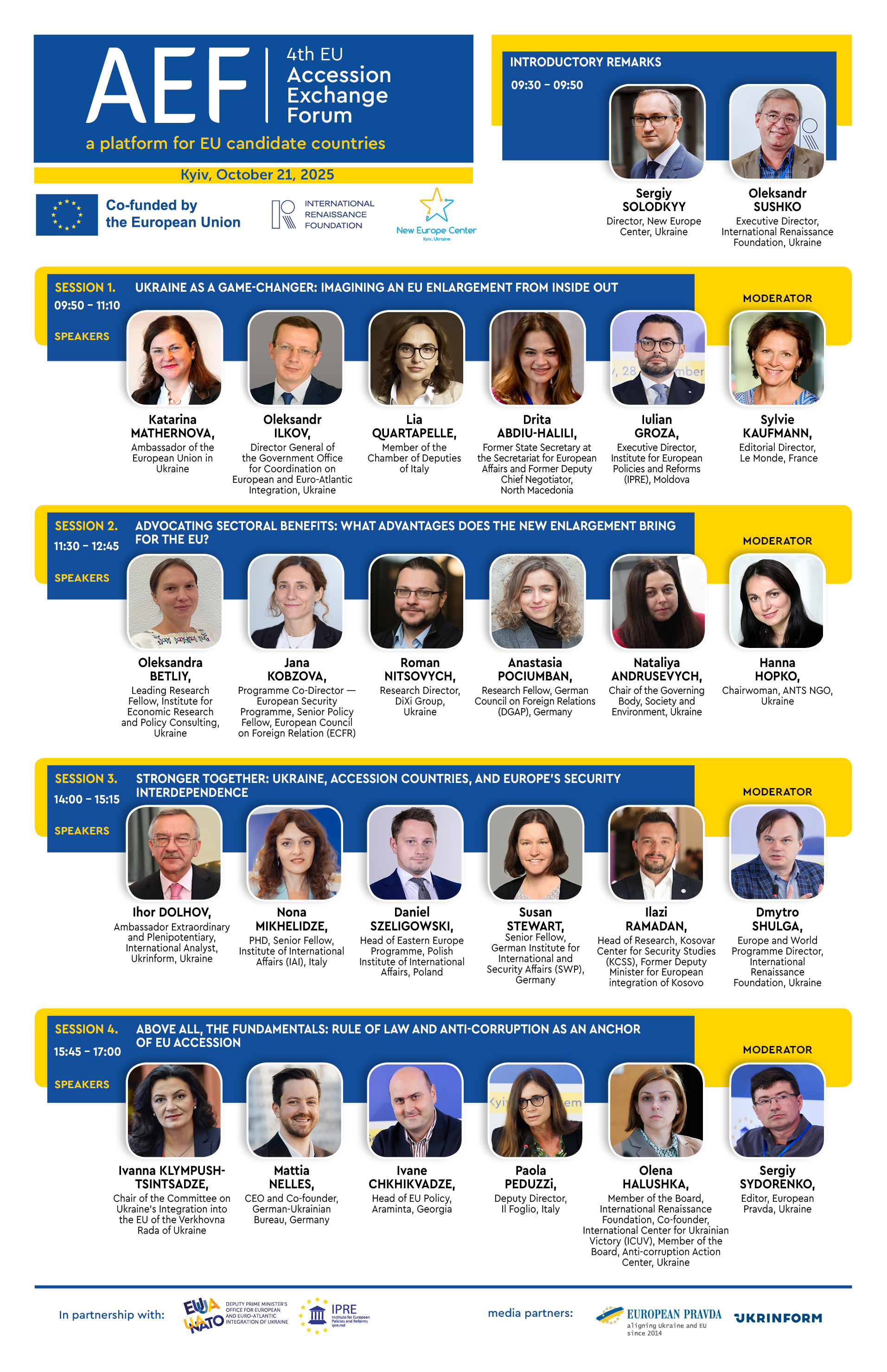 The EU Accession Exchange Forum is organized by the New Europe Center in partnership with the Office of the Deputy Prime Minister for European and Euro-Atlantic Integration of Ukraine, the International Renaissance Foundation, and the Institute for European Policies and Reforms (Republic of Moldova), with Ukrinform and European Pravda serving as media partners. The EU Accession Exchange Forum is taking place with EU support, within the EU-funded “Whole-of-Society Accession” project implemented by the International Renaissance Foundation.