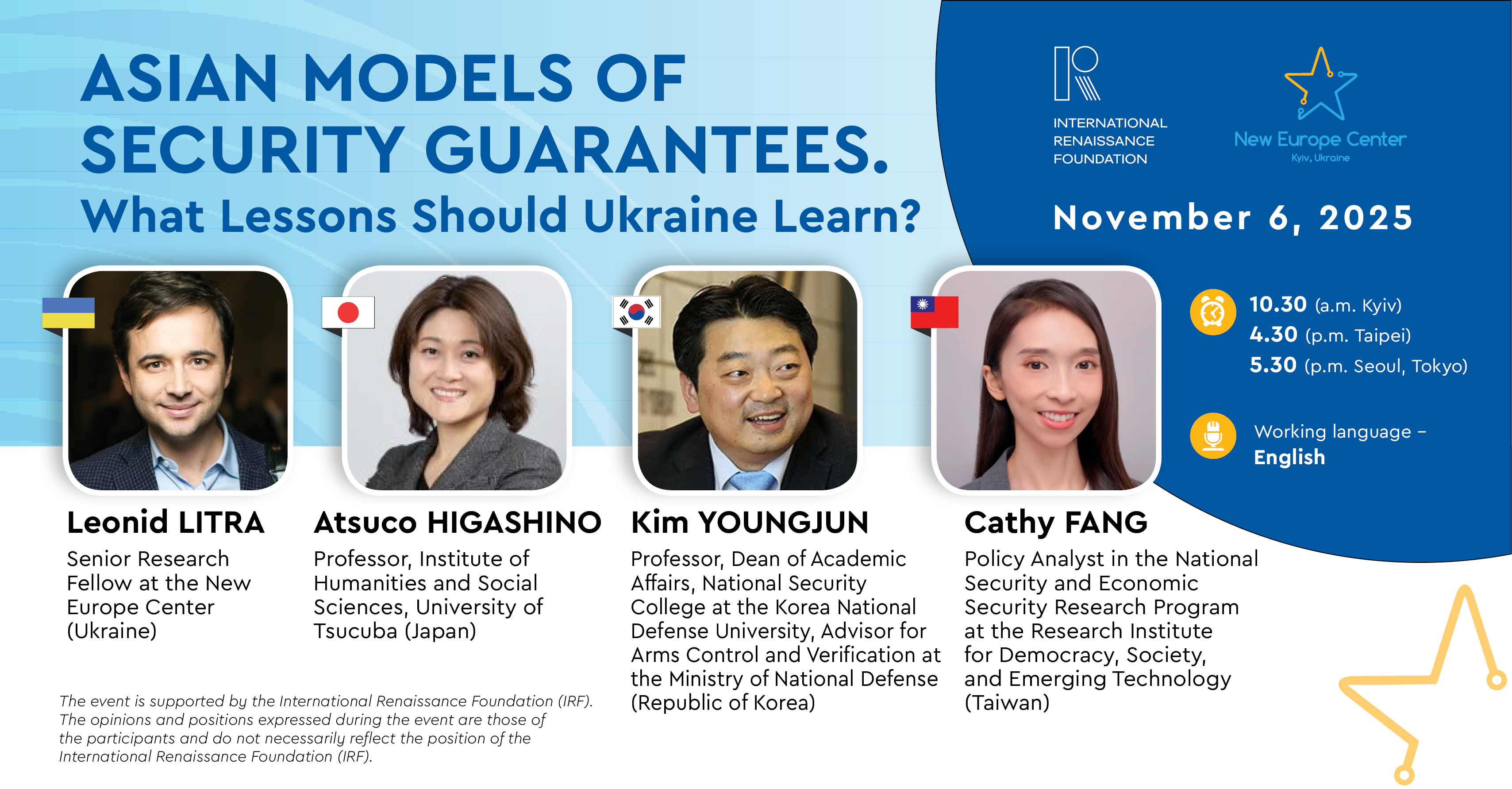 Experts from Ukraine, Japan, South Korea, and Taiwan will discuss the effectiveness of alliance-based guarantees, self-reliant defense capacities, and the future of global deterrence systems.