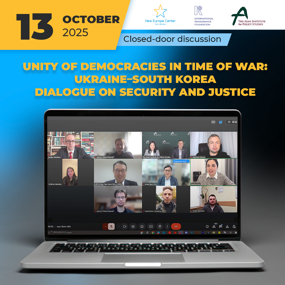 On October 13, 2025, the New Europe Center (Ukraine) held together with the Asan Institute for Policy Studies (South Korea) an online roundtable discussion “Building Stronger Democratic Partnerships Between Asia and Europe: Ukraine & South Korea Perspectives”.