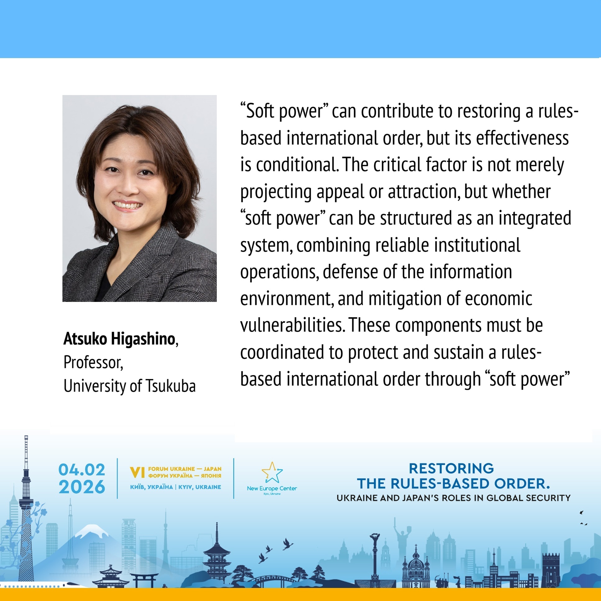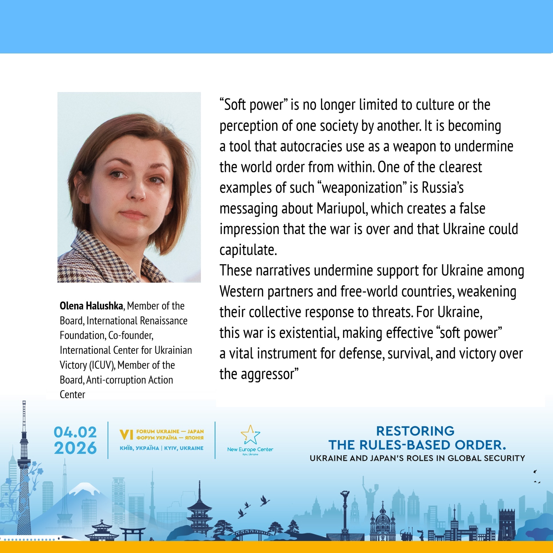 “Soft power” is no longer exclusively based on attraction; it must be combined with credibility, informational accessibility, and control over information channels. The issue of “soft power” weaponization is significant. In Japan, the discussion often focuses on China in the context of “sharp power”. While the situation in Ukraine may differ, it is important to analyze and address the weaponization of “soft power”, as well as the “sharp power” strategies of Russia and China.
