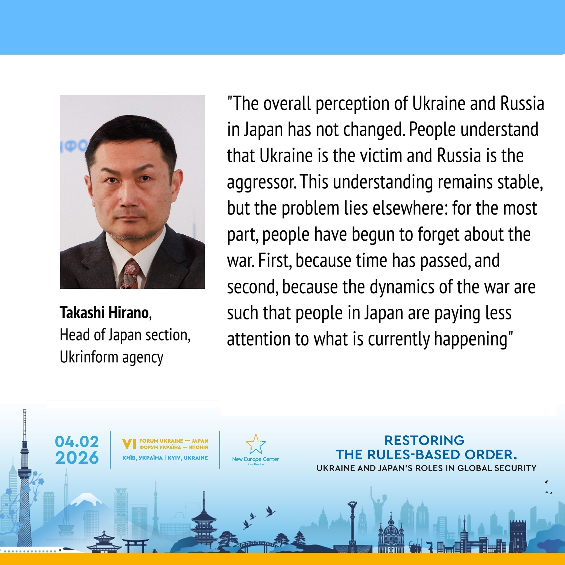 The overall perception of Ukraine and Russia in Japan has not changed. People understand that Ukraine is the victim and Russia is the aggressor. This understanding remains stable, but the problem lies elsewhere: for the most part, people have begun to forget about the war. First, because time has passed, and second, because the dynamics of the war are such that people in Japan are paying less attention to what is currently happening.
