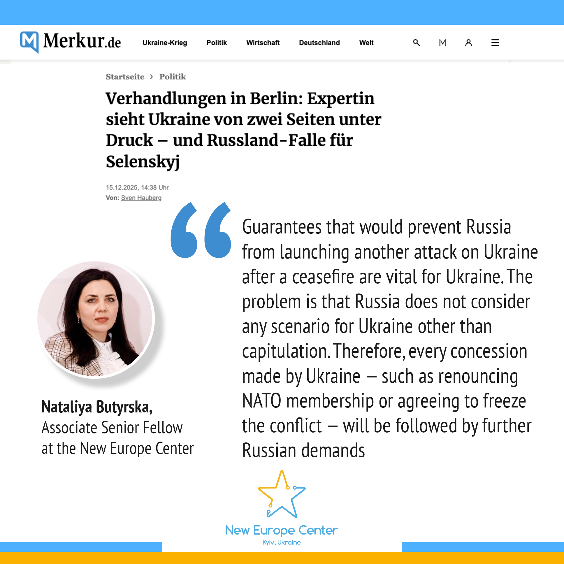Nataliya Butyrska, Associate Senior Fellow at the New Europe Center, commented on the Berlin negotiations on ending Russia’s war against Ukraine in an interview with Merkur.de.