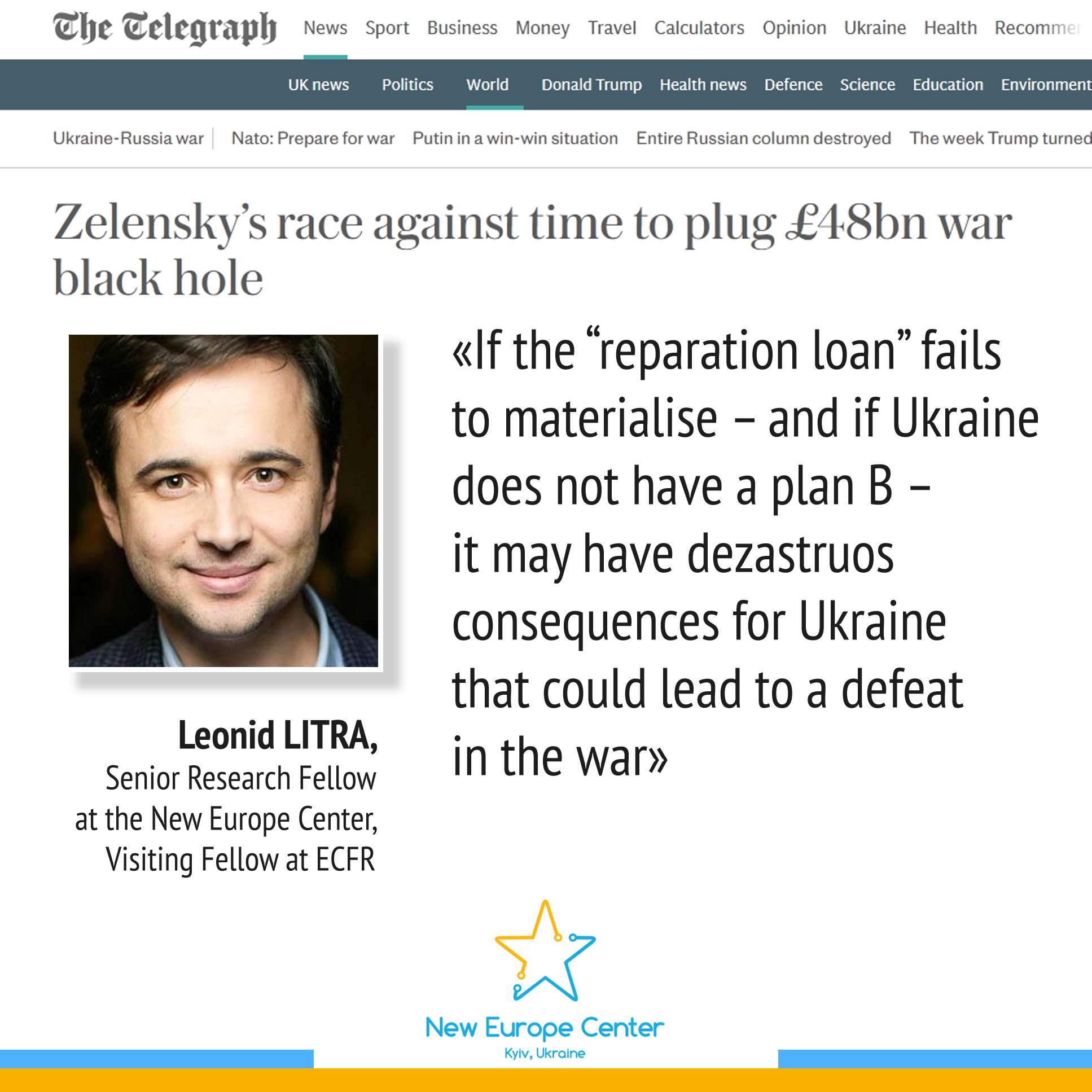 If the “reparation loan” fails to materialise – and if Ukraine does not have a plan B – it may have dezastruos consequences for Ukraine that could lead to a defeat in the war”.