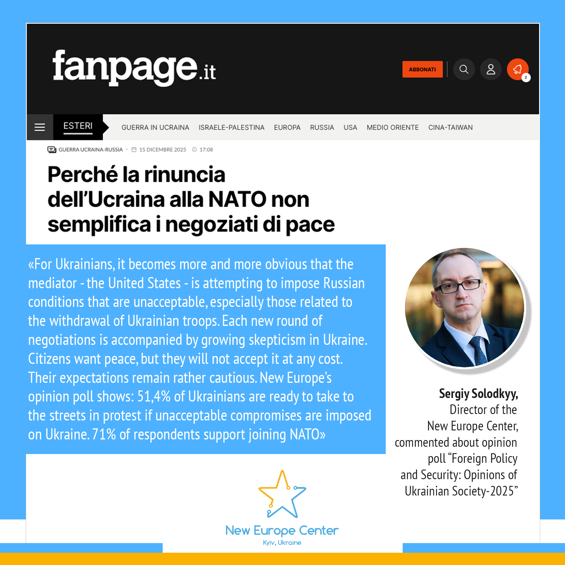 Sergiy Solodkyy, Director of the New Europe Center, commented about opinion poll results “Foreign Policy and Security: Opinions of Ukrainian Society-2025” to Italian media Fanpage.it.