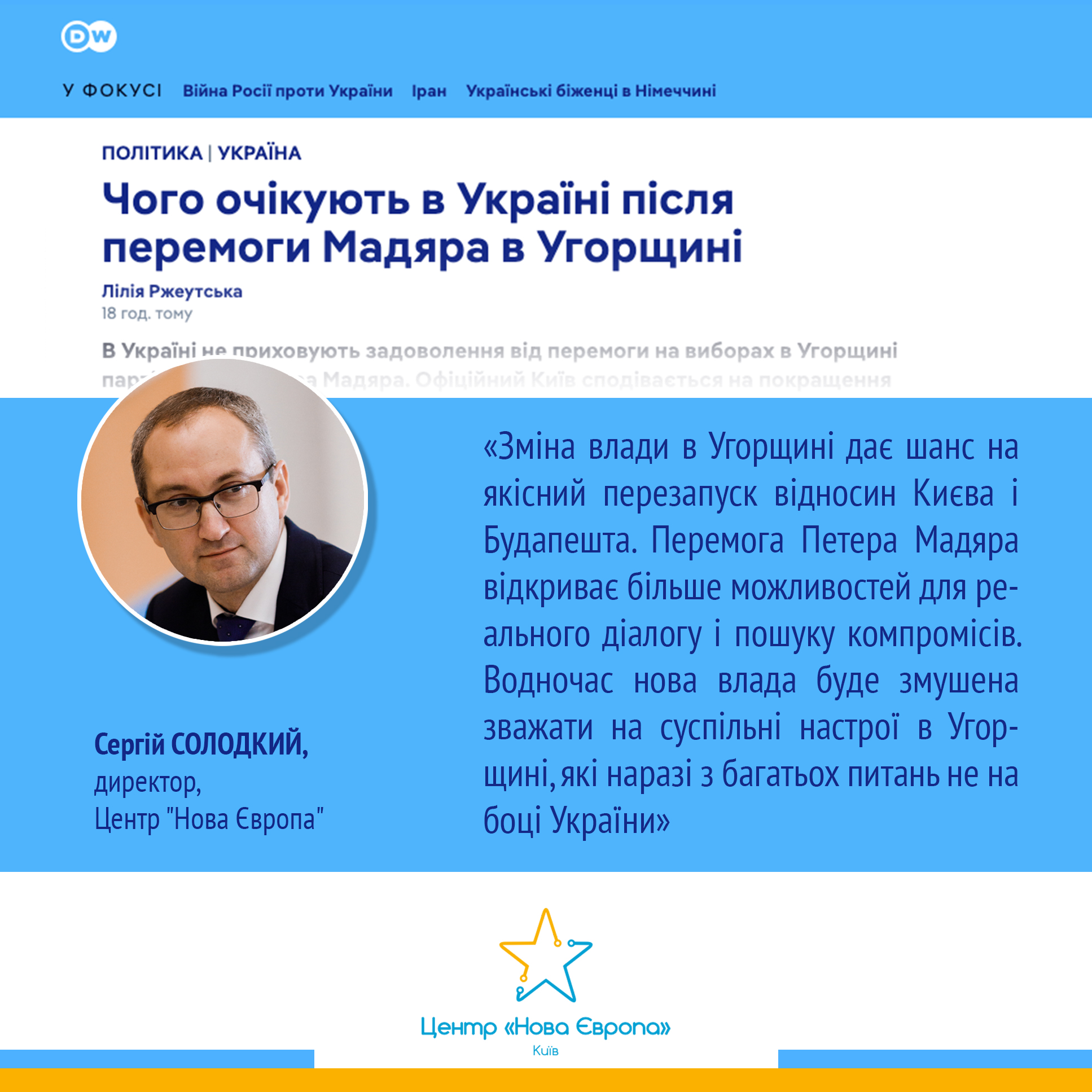 «Зміна влади в Угорщині дає шанс на якісний перезапуск відносин Києва і Будапешта. Перемога Петера Мадяра відкриває більше можливостей для реального діалогу і пошуку компромісів. Водночас нова влада буде змушена зважати на суспільні настрої в Угорщині, які наразі з багатьох питань не на боці України».