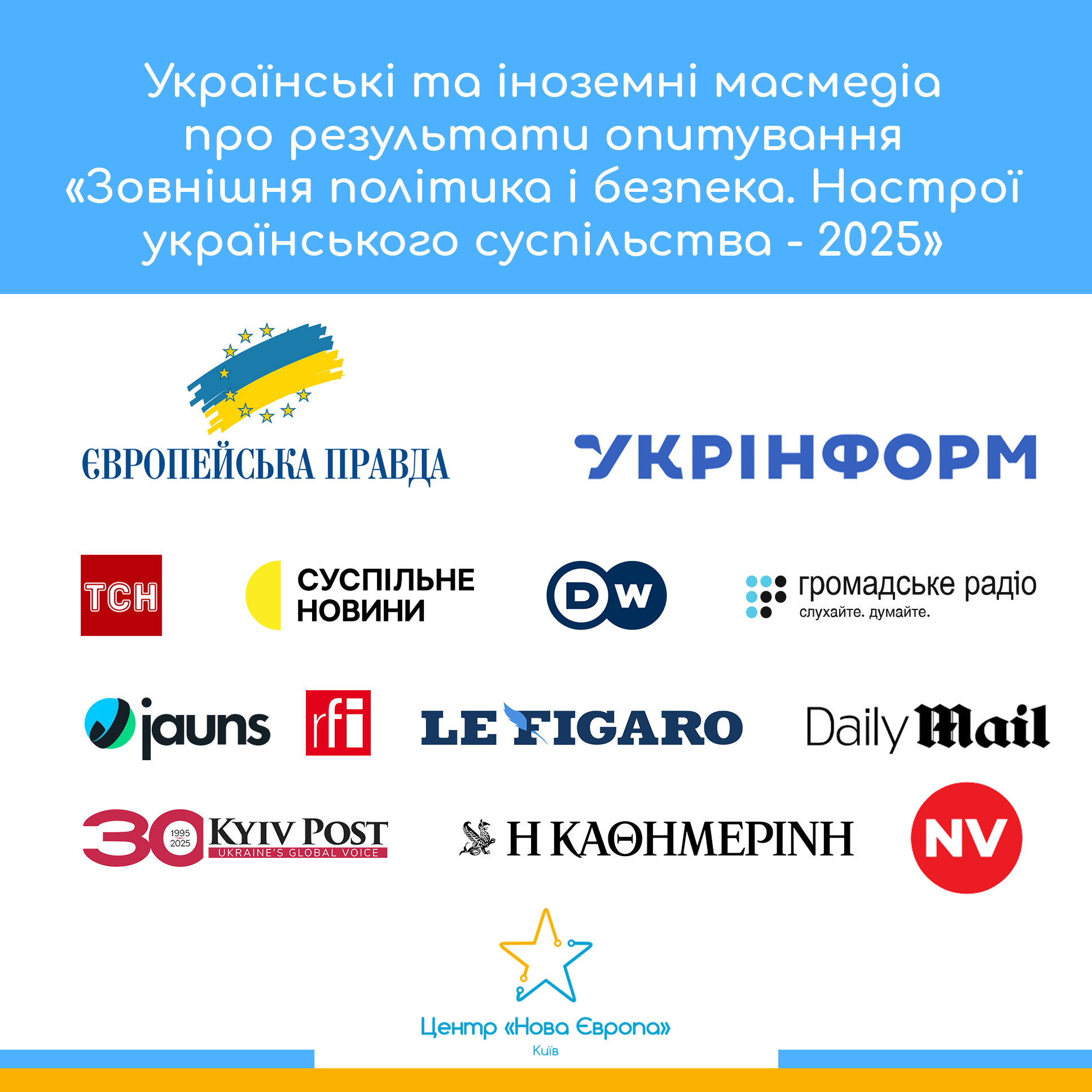Якщо ви ще не ознайомилися з результатами останнього опитування «Зовнішня політика і безпека. Настрої українського суспільства-2025» на сторінках «Нової Європи», то маєте шанс це зробити, прочитавши новини в масмедіа. Видання України, Великої Британії, Франції, Італії, Греції і не тільки розповіли своїм читачам про свіжі суспільні тренди в Україні.