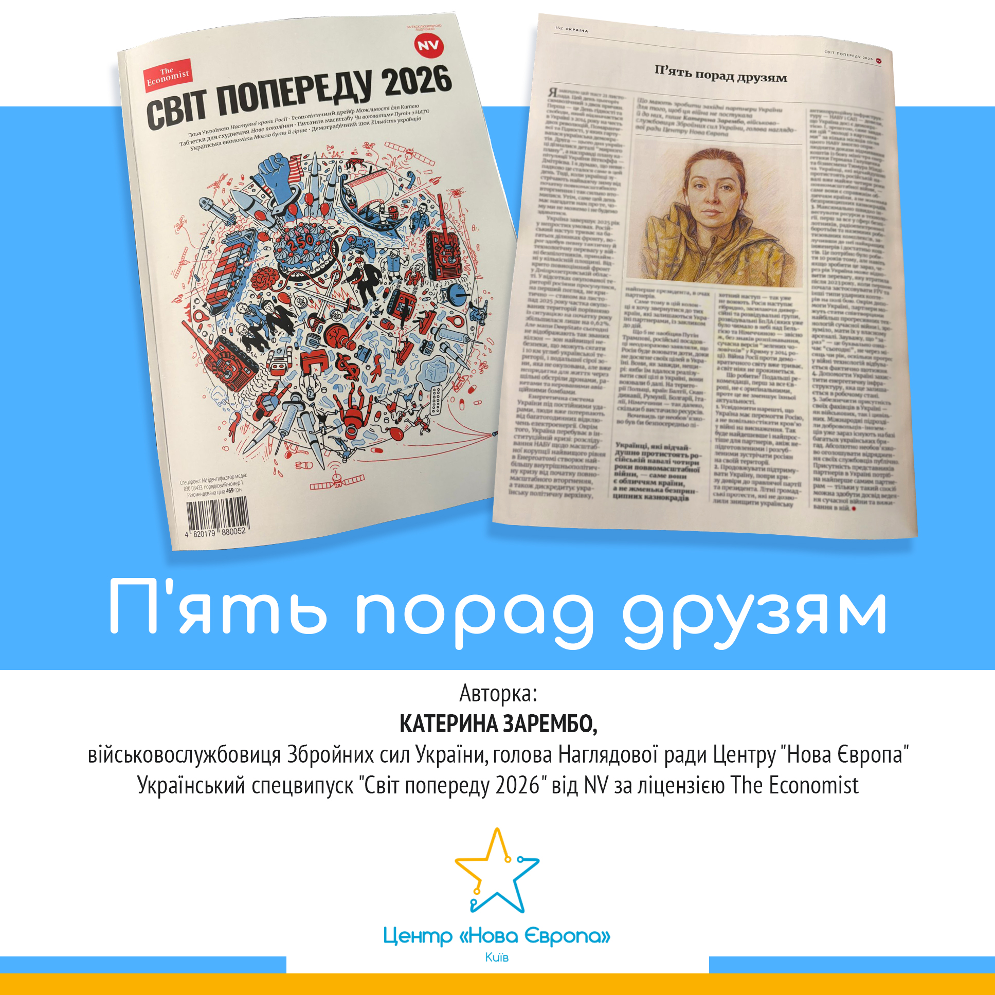 Катерина Зарембо, військовослужбовиця Збройних сил України, голова Наглядової ради Центру “Нова Європа”, у колонці в українському спецвипуску “Світ попереду 2026” від NV за ліцензією The Economist, поділилася рекомендаціями для західних партнерів. Нижче – коротка версія цих порад: