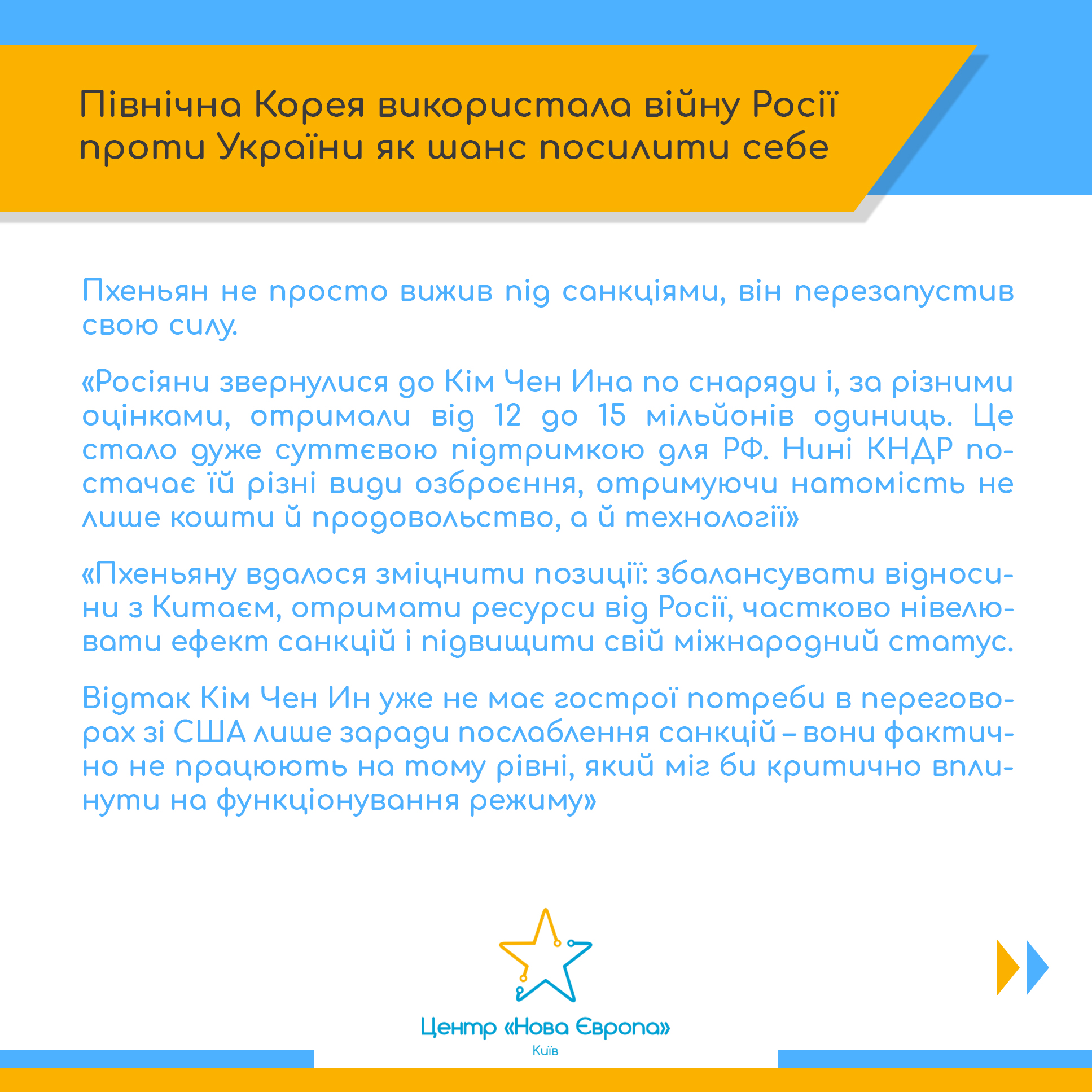 - пояснює, як співпраця з Росією дозволила КНДР отримати ресурси, технології та частково нівелювати ефект санкцій;