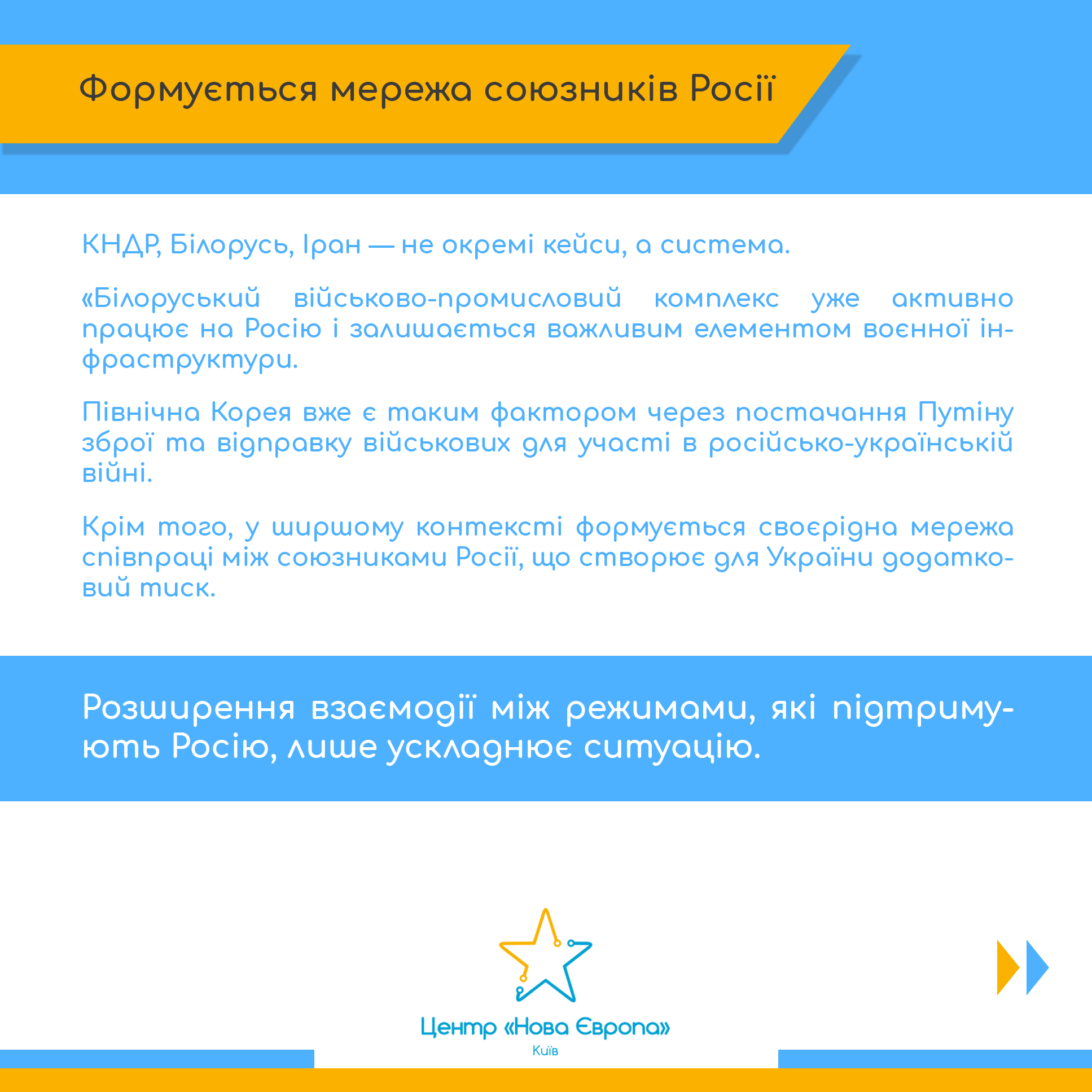 - звертає увагу на формування ширшої мережі взаємодії між союзниками Росії, що створює додаткові ризики для України;