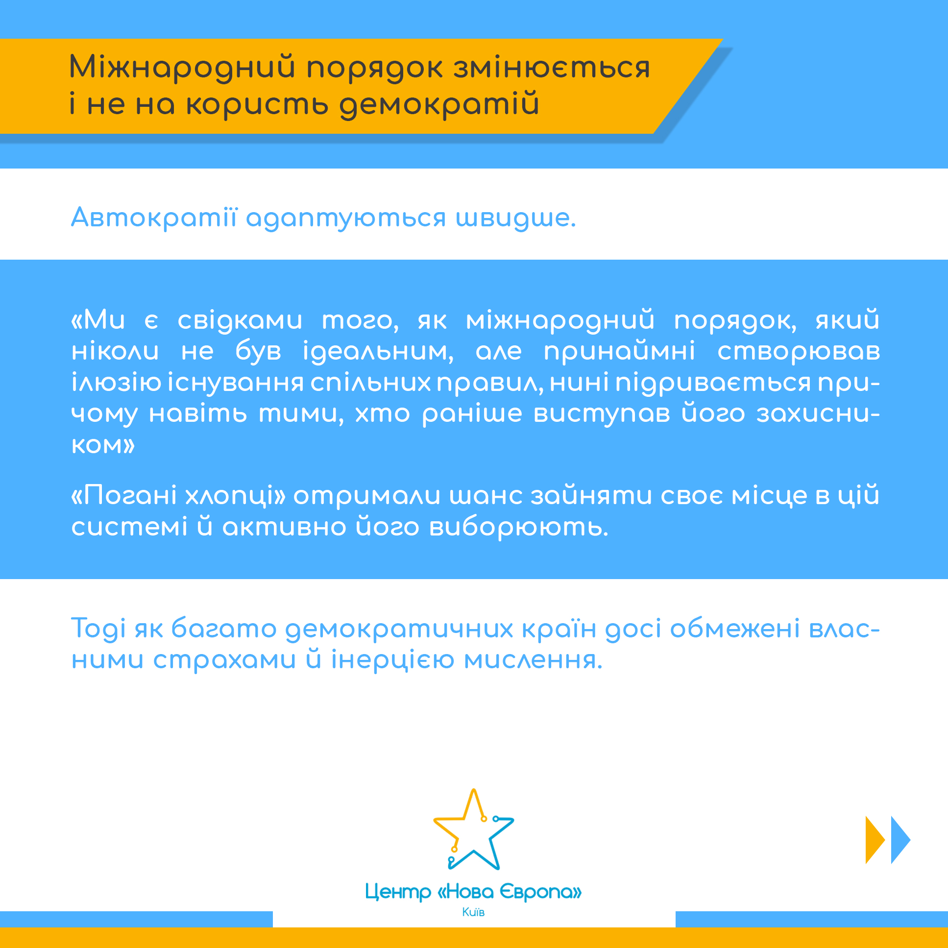 - аналізує, як у світі зростає роль автократій, які швидше адаптуються до нових умов і намагаються змінити правила міжнародного порядку.