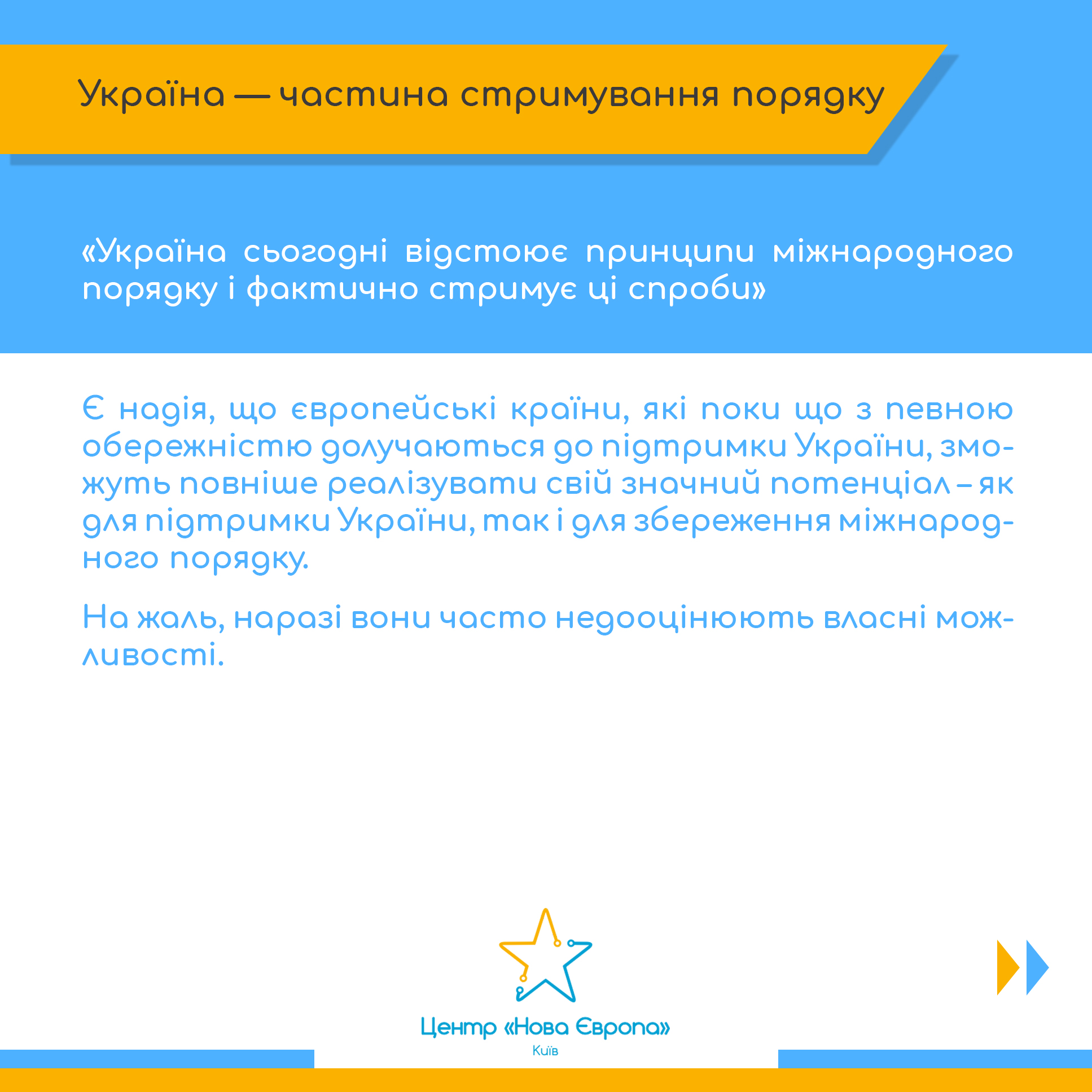 «Ми є свідками того, як міжнародний порядок, який ніколи не був ідеальним, але принаймні створював ілюзію існування спільних правил, нині підривається причому навіть тими, хто раніше виступав його захисником. Україна сьогодні відстоює принципи міжнародного порядку і фактично стримує спроби автократій нав’язати власні «правила» світові. Є надія, що європейські країни, які поки що з певною обережністю долучаються до підтримки України, зможуть повніше реалізувати свій значний потенціал – як для підтримки України, так і для збереження міжнародного порядку»