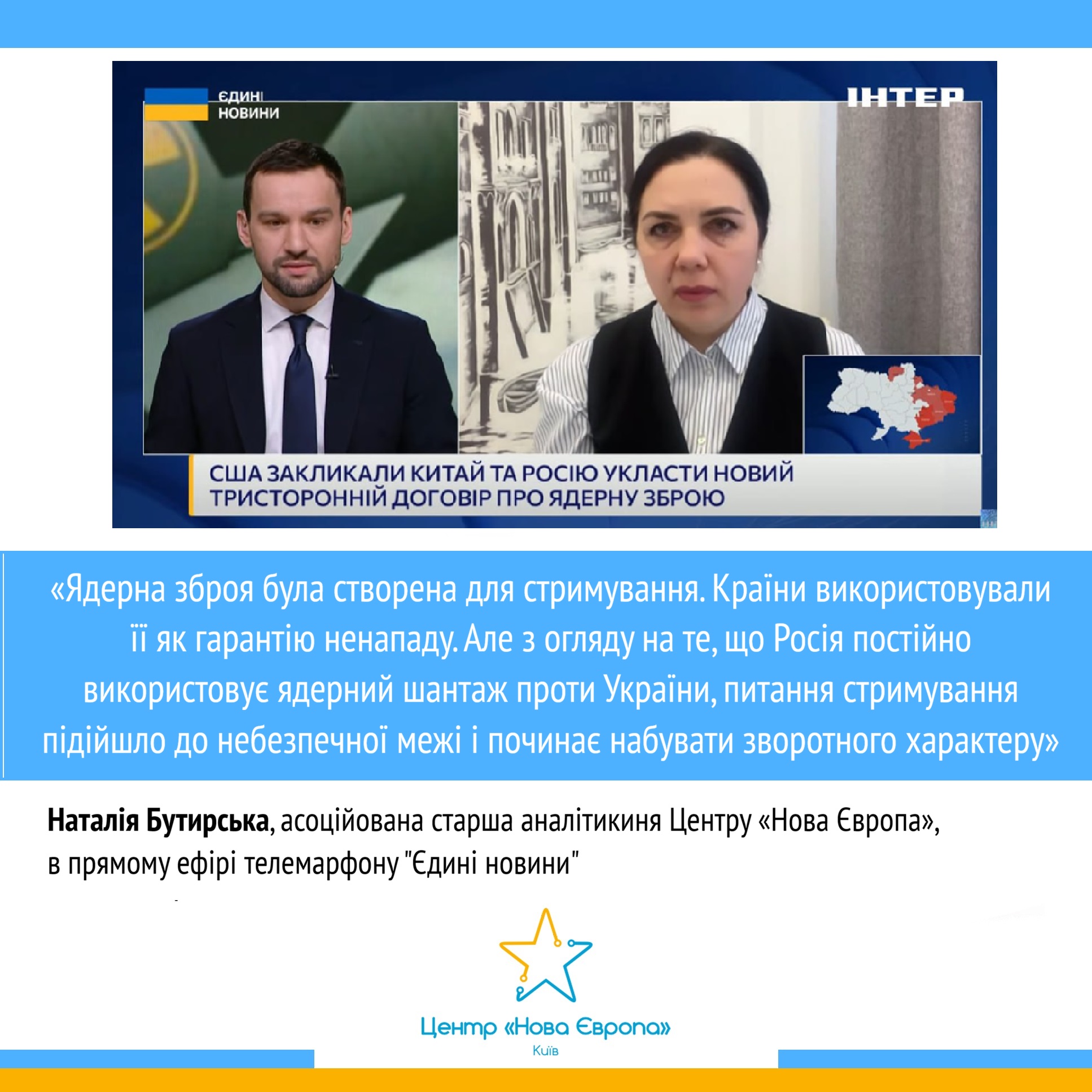 Наталія Бутирська, асоційована старша аналітикиня Центру «Нова Європа», в прямому ефірі телемарафону “Єдині новини” пояснила, як Росія використовує ядерний шантаж і дезінформаційні наративи для затягування війни проти України та впливу на міжнародні переговори. Вона наголосила, що така риторика підриває довіру до майбутніх угод з контролю над озброєннями та змушує європейські країни серйозніше замислюватися над власними механізмами стримування.
