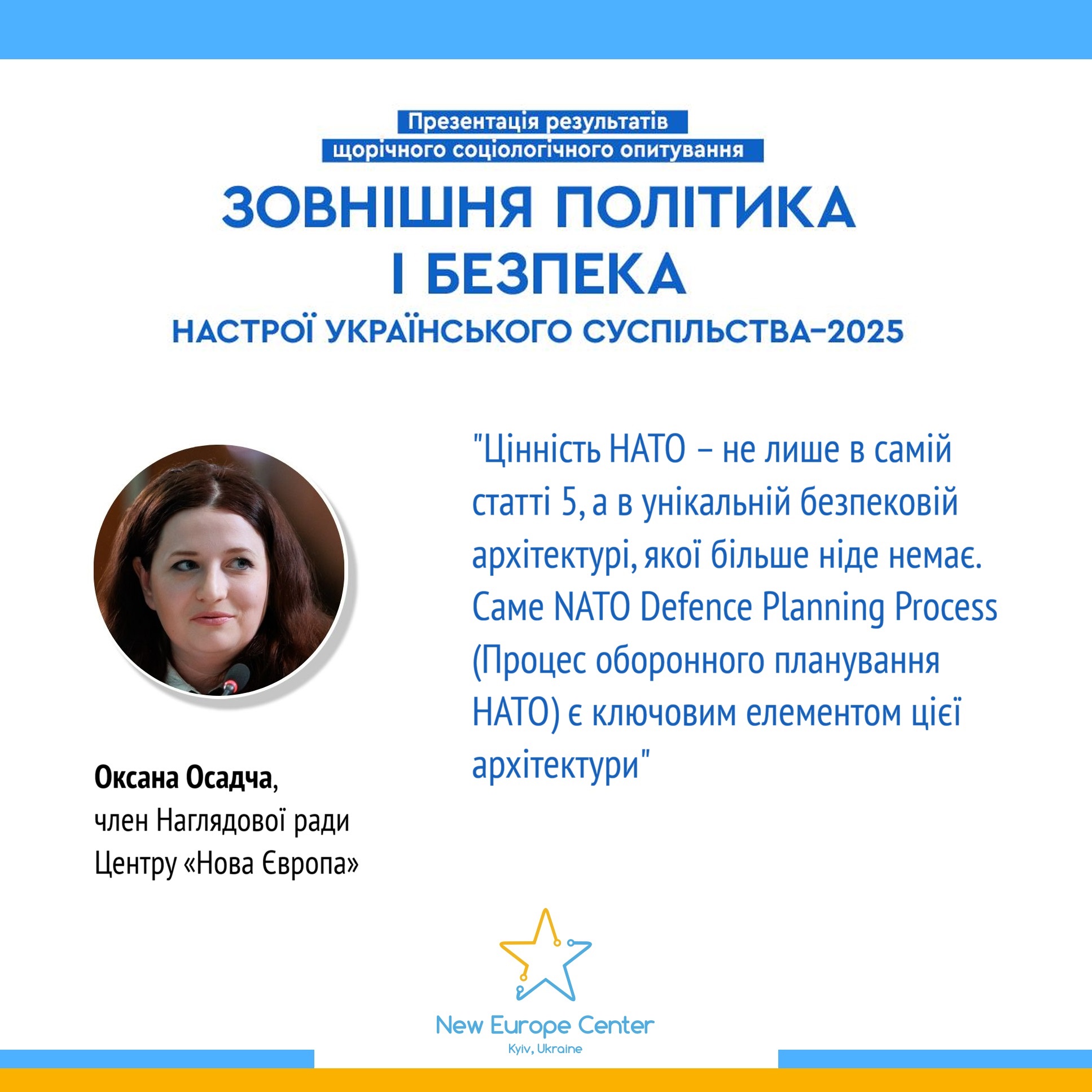 Оксана Осадча, член Наглядової ради Центру «Нова Європа», під час нещодавньої презентації результатів опитування “Зовнішня політика і безпека – 2025” говорила про розрив між емоційним фоном у публічному просторі та реальними стратегічними настроями українського суспільства, підкреслюючи збереження курсу на сильні Збройні сили, суверенітет і євроатлантичну інтеграцію.